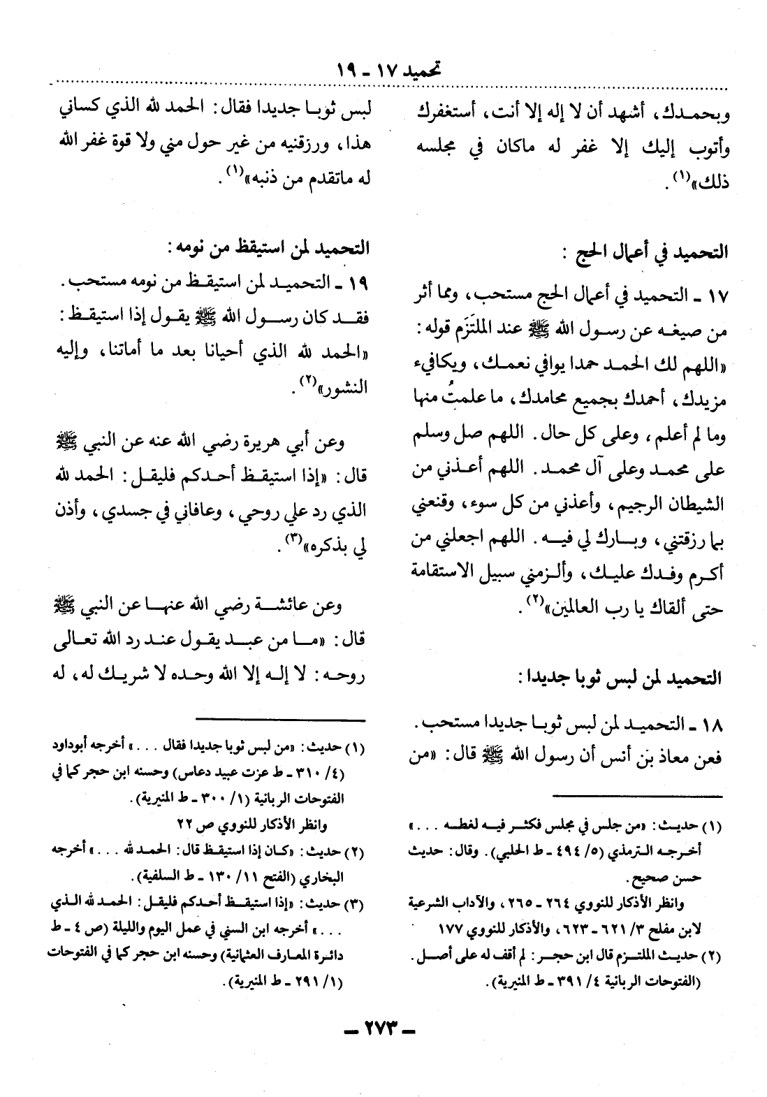 18 - التَّحْمِيدُ لِمَنْ لَبِسَ ثَوْبًا جَدِيدًا مُسْتَحَبٌّ. فَعَنْ مُعَاذِ بْنِ أَنَسٍ أَنَّ رَسُول اللَّهِ صَلَّى اللَّهُ عَلَيْهِ وَسَلَّمَ قَال: مَنْ