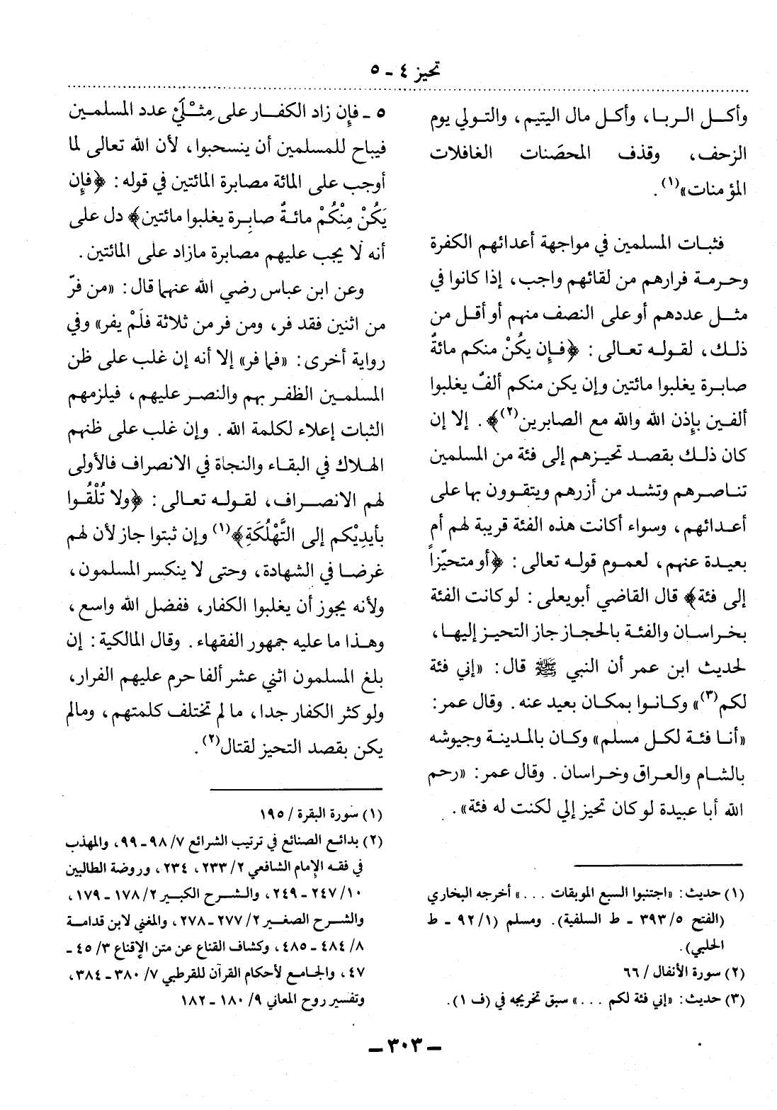 فَثَبَاتُ الْمُسْلِمِينَ فِي مُوَاجَهَةِ أَعْدَائِهِمُ الْكَفَرَةِ وَحُرْمَةُ فِرَارِهِمْ مِنْ لِقَائِهِمْ وَاجِبٌ، إِذَا كَانُوا فِي مِثْل عَدَدِهِمْ أَوْ عَلَى النِّصْفِ مِنْهُمْ أَوْ أَقَل مِنْ ذَلِكَ، لِقَوْلِهِ تَعَالَى: {فَإِنْ يَكُنْ مِنْكُمْ مِائَةٌ صَابِرَةٌ يَغْلِبُوا مِائَتَيْنِ وَإِنْ يَكُنْ مِنْكُمْ أَلْفٌ يَغْلِبُوا أَلْفَيْنِ بِإِذْنِ اللَّهِ وَاللَّهُ مَعَ الصَّابِرِينَ} . (2) إِلاَّ إِنْ كَانَ ذَلِكَ بِقَصْدِ تَحَيُّزِهِمْ إِلَى فِئَةٍ مِنَ الْمُسْلِمِينَ تُنَاصِرُهُمْ وَتَشُدُّ مِنْ أَزْرِهِمْ وَيَتَقَوَّوْنَ بِهَا عَلَى أَعْدَائِهِمْ، وَسَوَاءٌ أَكَانَتْ هَذِهِ الْفِئَةُ قَرِيبَةً لَهُمْ أَمْ بَعِيدَةً عَنْهُمْ، لِعُمُومِ قَوْله تَعَالَى: {أَوْ مُتَحَيِّزًا إِلَى فِئَةٍ} قَال الْقَاضِي أَبُو يَعْلَى: لَوْ كَانَتِ الْفِئَةُ بِخُرَاسَانَ وَالْفِئَةُ بِالْحِجَازِ جَازَ التَّحَيُّزُ إِلَيْهَا، لِحَدِيثِ ابْنِ عُمَرَ أَنَّ النَّبِيَّ صَلَّى اللَّهُ عَلَيْهِ وَسَلَّمَ قَال: إِنِّي فِئَةٌ لَكُمْ (3) وَكَانُوا بِمَكَانٍ بَعِيدٍ عَنْهُ. وَقَال عُمَرُ: " أَنَا فِئَةٌ لِكُل مُسْلِمٍ " وَكَانَ بِالْمَدِينَةِ وَجُيُوشُهُ بِالشَّامِ وَالْعِرَاقِ وَخُرَاسَانَ. وَقَال عُمَرُ: رَحِمَ اللَّهُ أَبَا عُبَيْدَةَ لَوْ كَانَ تَحَيَّزَ إِلَيَّ لَكُنْتُ لَهُ فِئَةً.