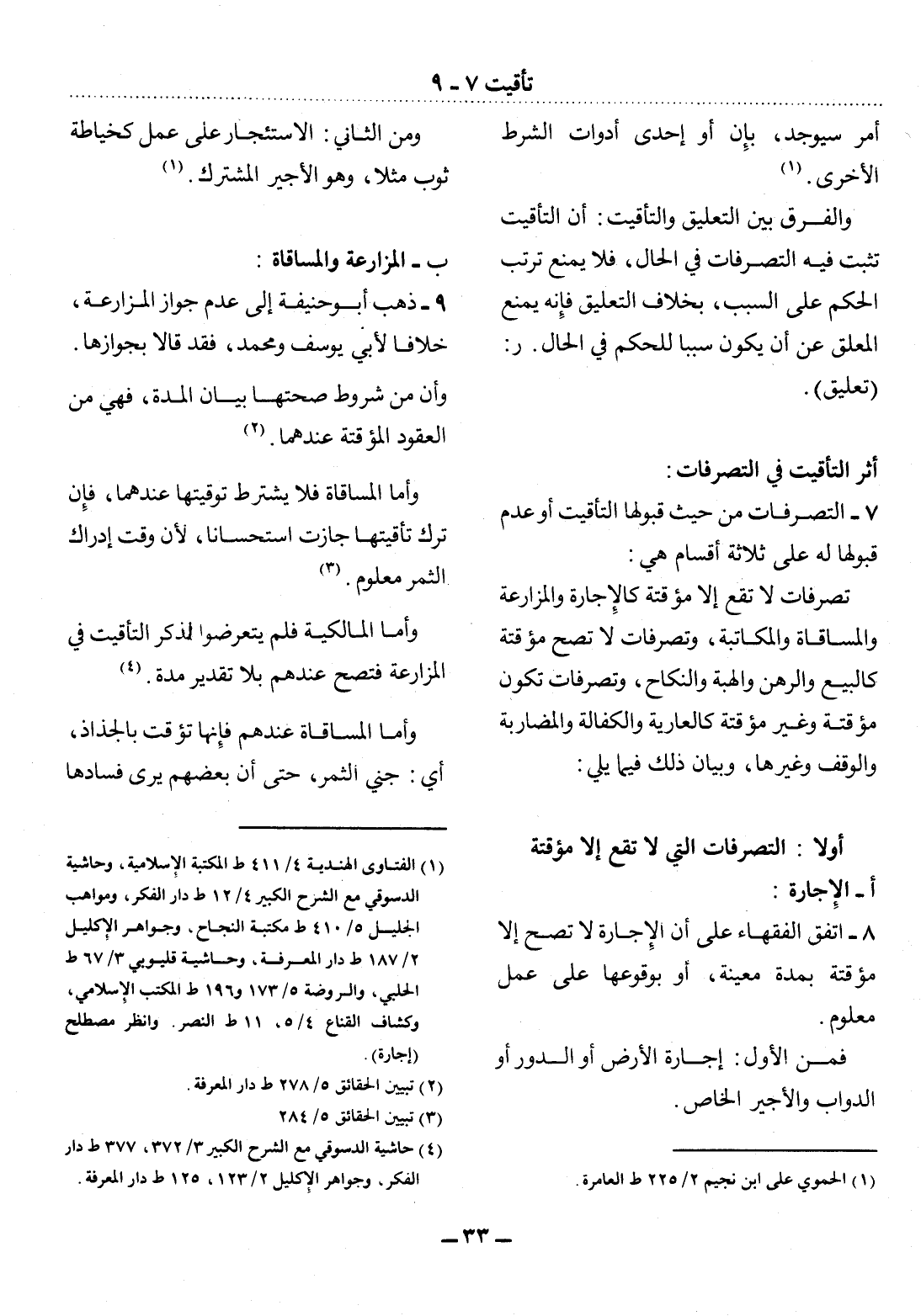 7 - التَّصَرُّفَاتُ مِنْ حَيْثُ قَبُولُهَا التَّأْقِيتَ أَوْ عَدَمُ قَبُولِهَا لَهُ عَلَى ثَلاَثَةِ أَقْسَامٍ هِيَ: تَصَرُّفَاتٌ لاَ تَقَعُ إِلاَّ مُؤَقَّتَةً كَالإِْجَارَةِ وَالْمُزَارَعَةِ وَالْمُسَاقَاةِ وَالْمُكَاتَبَةِ، وَتَصَرُّفَاتٌ لاَ تَصِحُّ مُؤَقَّتَةً كَالْبَيْعِ وَالرَّهْنِ وَالْهِبَةِ وَالنِّكَاحِ، وَتَصَرُّفَاتٌ تَكُونُ مُؤَقَّتَةً وَغَيْرَ مُؤَقَّتَةٍ كَالْعَارِيَّةِ وَالْكَفَالَةِ وَالْمُضَارَبَةِ وَالْوَقْفِ وَغَيْرِهَا، وَبَيَانُ ذَلِكَ فِيمَا يَلِي: