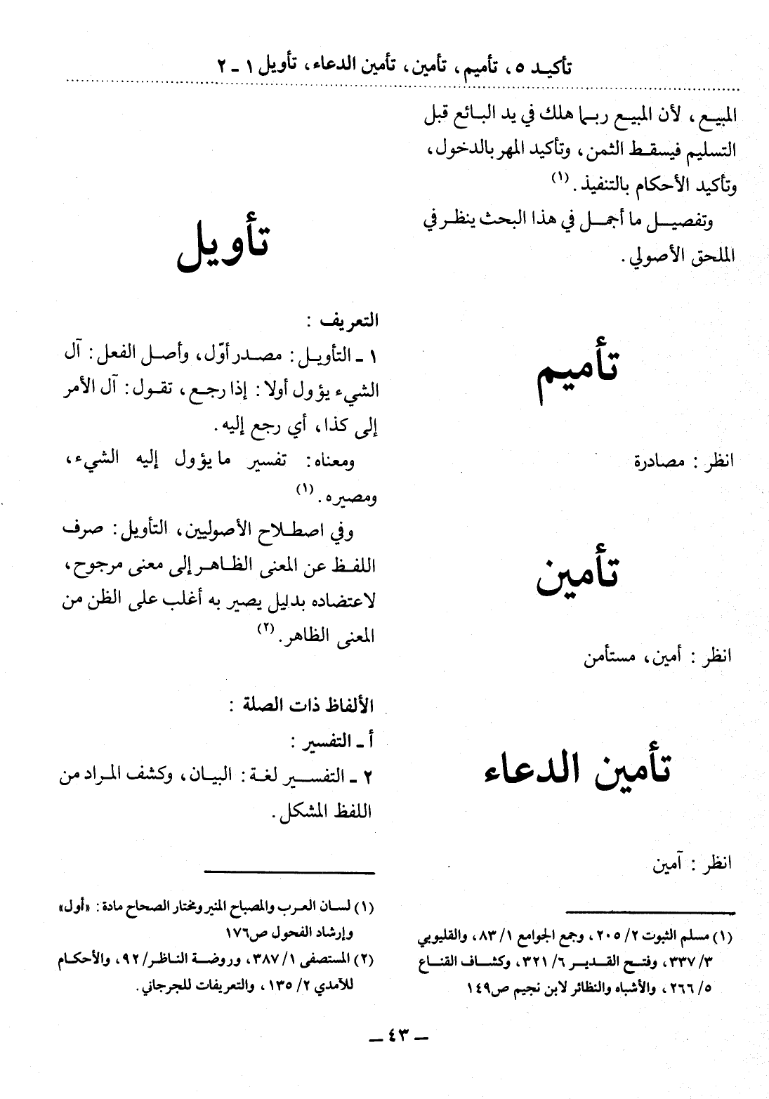 1 - التَّأْوِيل: مَصْدَرُ أَوَّل، وَأَصْل الْفِعْل: آل الشَّيْءُ يَئُول أَوْلاً: إِذَا رَجَعَ، تَقُول: آل الأَْمْرُ إِلَى كَذَا، أَيْ رَجَعَ إِلَيْهِ. وَمَعْنَاهُ: تَفْسِيرُ مَا يَئُول إِلَيْهِ الشَّيْءُ، وَمَصِيرُهُ. (1) وَفِي اصْطِلاَحِ الأُْصُولِيِّينَ، التَّأْوِيل: صَرْفُ اللَّفْظِ عَنِ الْمَعْنَى الظَّاهِرِ إِلَى مَعْنًى مَرْجُوحٍ، لاِعْتِضَادِهِ بِدَلِيلٍ يَصِيرُ بِهِ أَغْلَبَ عَلَى الظَّنِّ مِنَ الْمَعْنَى الظَّاهِرِ (2) .