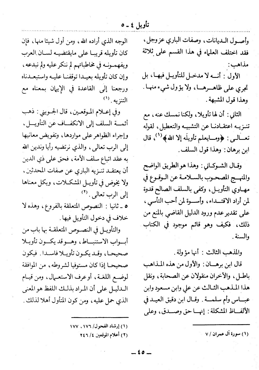الْوَجْهِ الَّذِي أَرَادَهُ اللَّهُ، وَمَنْ أَوَّل شَيْئًا مِنْهَا، فَإِنْ كَانَ تَأْوِيلُهُ قَرِيبًا عَلَى مَا يَقْتَضِيهِ لِسَانُ الْعَرَبِ وَيَفْهَمُونَهُ فِي مُخَاطَبَاتِهِمْ لَمْ نُنْكِرْ عَلَيْهِ وَلَمْ نُبَدِّعْهُ، وَإِنْ كَانَ تَأْوِيلُهُ بَعِيدًا تَوَقَّفْنَا عَلَيْهِ وَاسْتَبْعَدْنَاهُ وَرَجَعْنَا إِلَى الْقَاعِدَةِ فِي الإِْيمَانِ بِمَعْنَاهُ مَعَ التَّنْزِيهِ. (1) وَفِي إِعْلاَمِ الْمُوَقِّعِينَ، قَال الْجُوَيْنِيُّ: ذَهَبَ أَئِمَّةُ السَّلَفِ إِلَى الاِنْكِفَافِ عَنِ التَّأْوِيل، وَإِجْرَاءِ الظَّوَاهِرِ عَلَى مَوَارِدِهَا، وَتَفْوِيضِ مَعَانِيهَا إِلَى الرَّبِّ تَعَالَى، وَالَّذِي نَرْتَضِيهِ رَأْيًا وَنَدِينُ اللَّهَ بِهِ عَقْدُ اتِّبَاعِ سَلَفِ الأُْمَّةِ، فَحُقَّ عَلَى ذِي الدِّينِ أَنْ يَعْتَقِدَ تَنْزِيهَ الْبَارِي عَنْ صِفَاتِ الْمُحْدَثِينَ، وَلاَ يَخُوضَ فِي تَأْوِيل الْمُشْكِلاَتِ، وَيَكِل مَعْنَاهَا إِلَى الرَّبِّ تَعَالَى. (2)