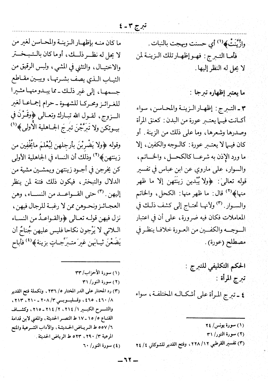 وَقَوْلِهِ {وَلاَ يَضْرِبْنَ بِأَرْجُلِهِنَّ لِيُعْلَمَ مَا يُخْفِينَ مِنْ زِينَتِهِنَّ} (2) وَذَلِكَ أَنَّ النِّسَاءَ فِي الْجَاهِلِيَّةِ الأُْولَى كُنَّ يَخْرُجْنَ فِي أَجْوَدِ زِينَتِهِنَّ وَيَمْشِينَ مِشْيَةً مِنَ الدَّلاَّل وَالتَّبَخْتُرِ، فَيَكُونُ ذَلِكَ فِتْنَةً لِمَنْ يَنْظُرُ إِلَيْهِنَّ. (3) حَتَّى الْقَوَاعِدُ مِنَ النِّسَاءِ، وَهُنَّ الْعَجَائِزُ وَنَحْوُهُنَّ مِمَّنْ لاَ رَغْبَةَ لِلرِّجَال فِيهِنَّ، نَزَل فِيهِنَّ: قَوْله تَعَالَى {وَالْقَوَاعِدُ مِنَ النِّسَاءِ اللاَّتِي لاَ يَرْجُونَ نِكَاحًا فَلَيْسَ عَلَيْهِنَّ جُنَاحٌ أَنْ يَضَعْنَ ثِيَابَهُنَّ غَيْرَ مُتَبَرِّجَاتٍ بِزِينَةٍ} (4) فَأَبَاحَ