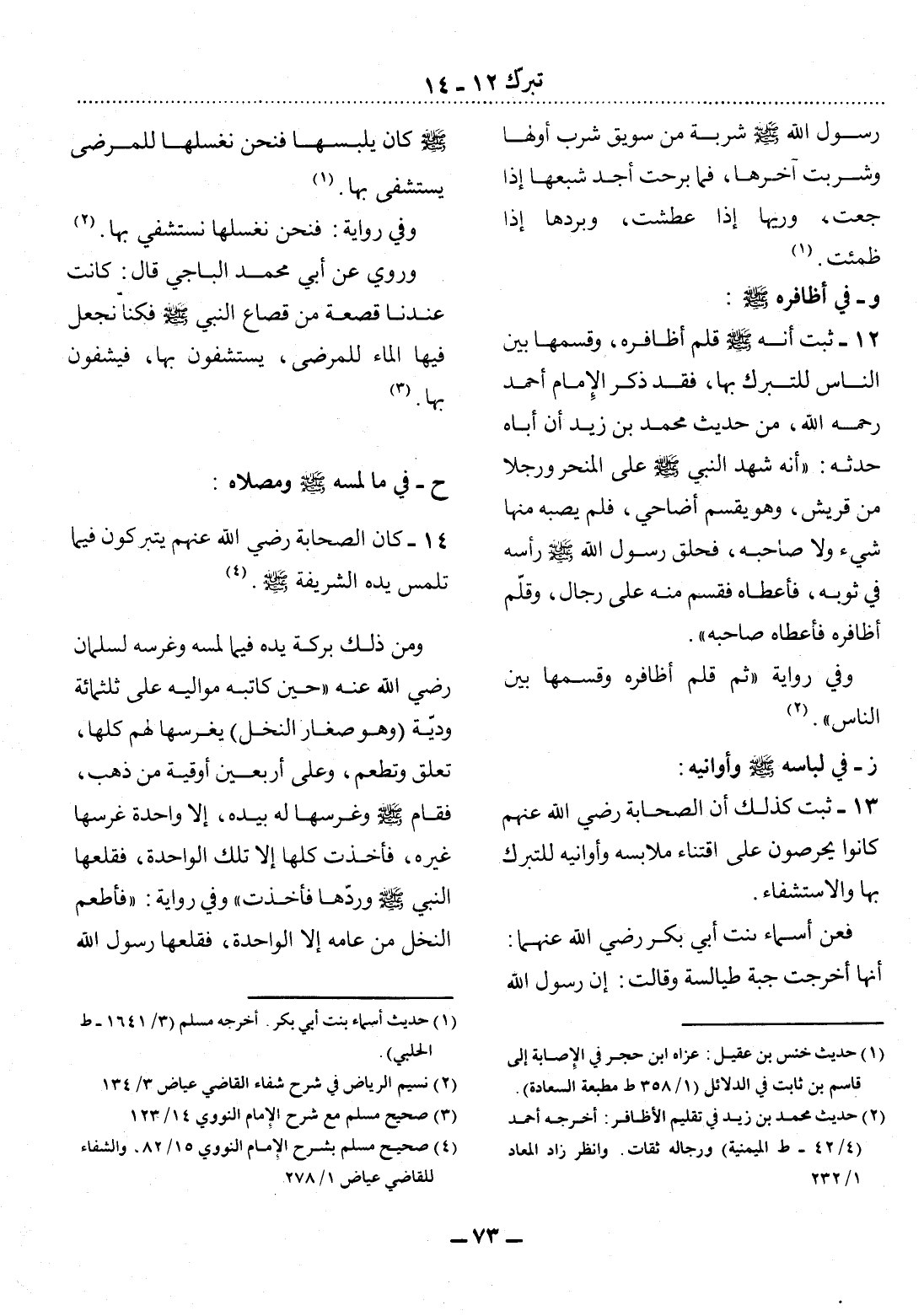 14 - كَانَ الصَّحَابَةُ رَضِيَ اللَّهُ عَنْهُمْ يَتَبَرَّكُونَ فِيمَا تَلْمِسُ يَدُهُ الشَّرِيفَةُ صَلَّى اللَّهُ عَلَيْهِ وَسَلَّمَ. (4)