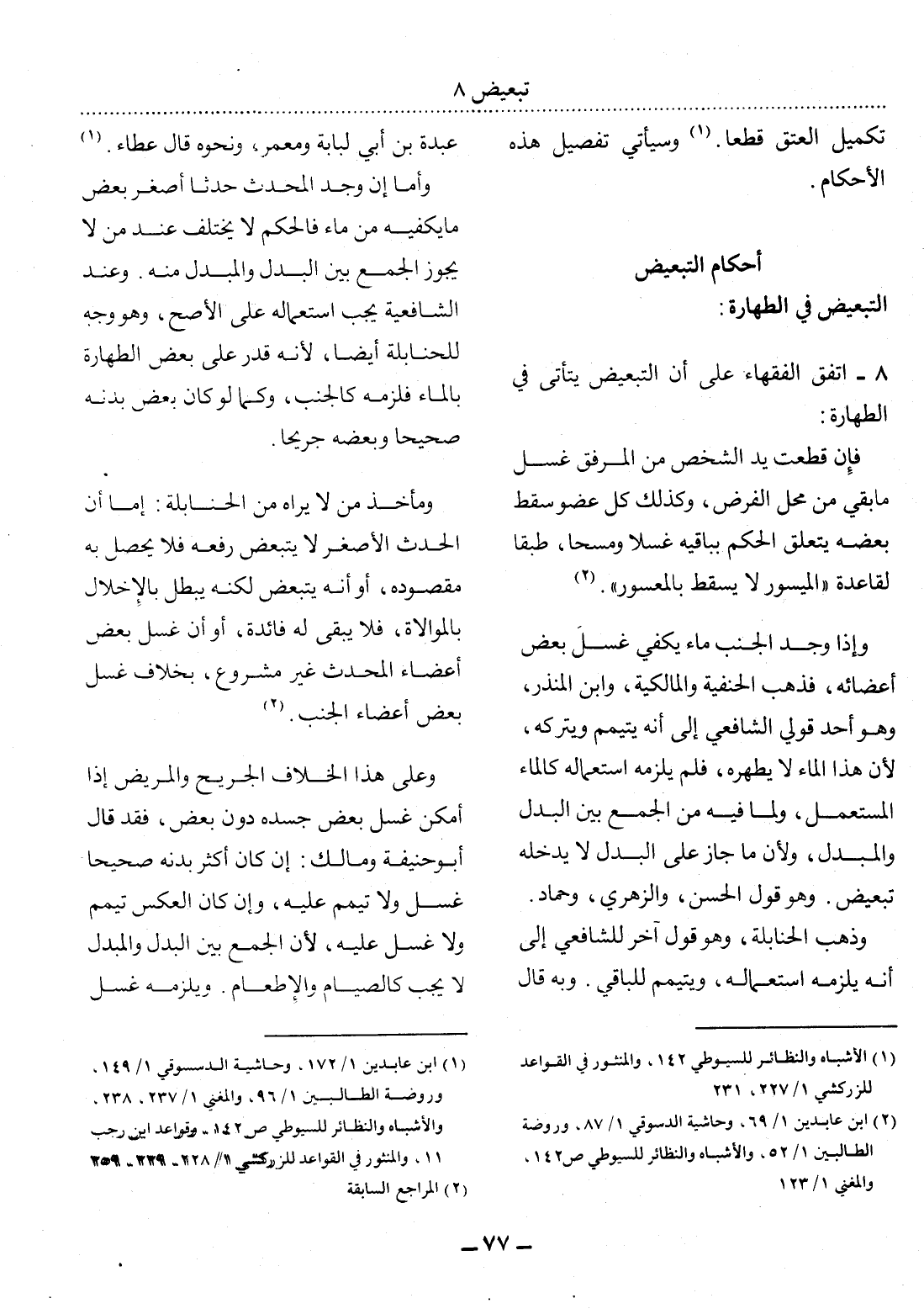 (1) ابن عابدين 1 / 172 وحاشية الدسوقي 1 / 149، وروضة الطالبين 1 / 96، والمغني 1 / 237، 238، والأشباه والنظائر للسيوطي ص 142. وقواعد ابن رجب 11، والمنثور في القواعد للزركشي 1 / 228، 229، 259.