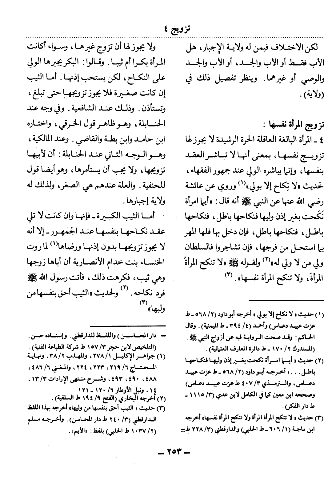 (3) حديث: " الثيب أحق بنفسها من وليها " أخرجه بهذا اللفظ الدارقطني (3 / 240 ط دار المحاسن) . وأخرجه مسلم (2 / 1037 ط الحلبي) بلفظ: " الأيم ".