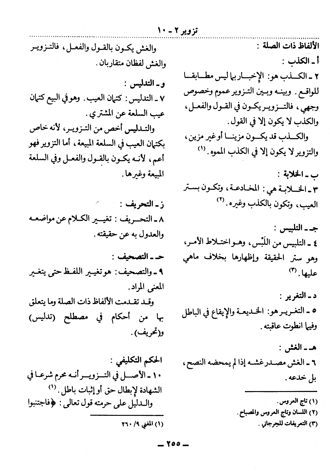 وَالْكَذِبُ قَدْ يَكُونُ مُزَيَّنًا أَوْ غَيْرَ مُزَيَّنٍ، وَالتَّزْوِيرُ لاَ يَكُونُ إِلاَّ فِي الْكَذِبِ الْمُمَوَّهِ. (1)