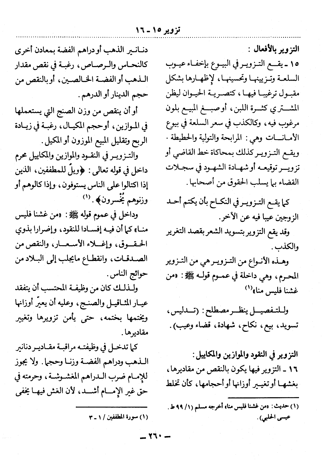 وَالتَّزْوِيرُ فِي النُّقُودِ وَالْمَوَازِينِ وَالْمَكَايِيل مُحَرَّمٌ دَاخِلٌ فِي قَوْله تَعَالَى: {وَيْلٌ لِلْمُطَفِّفِينَ الَّذِينَ إِذَا اكْتَالُوا عَلَى النَّاسِ يَسْتَوْفُونَ وَإِذَا كَالُوهُمْ أَوْ وَزَنُوهُمْ يُخْسِرُونَ} (1) .