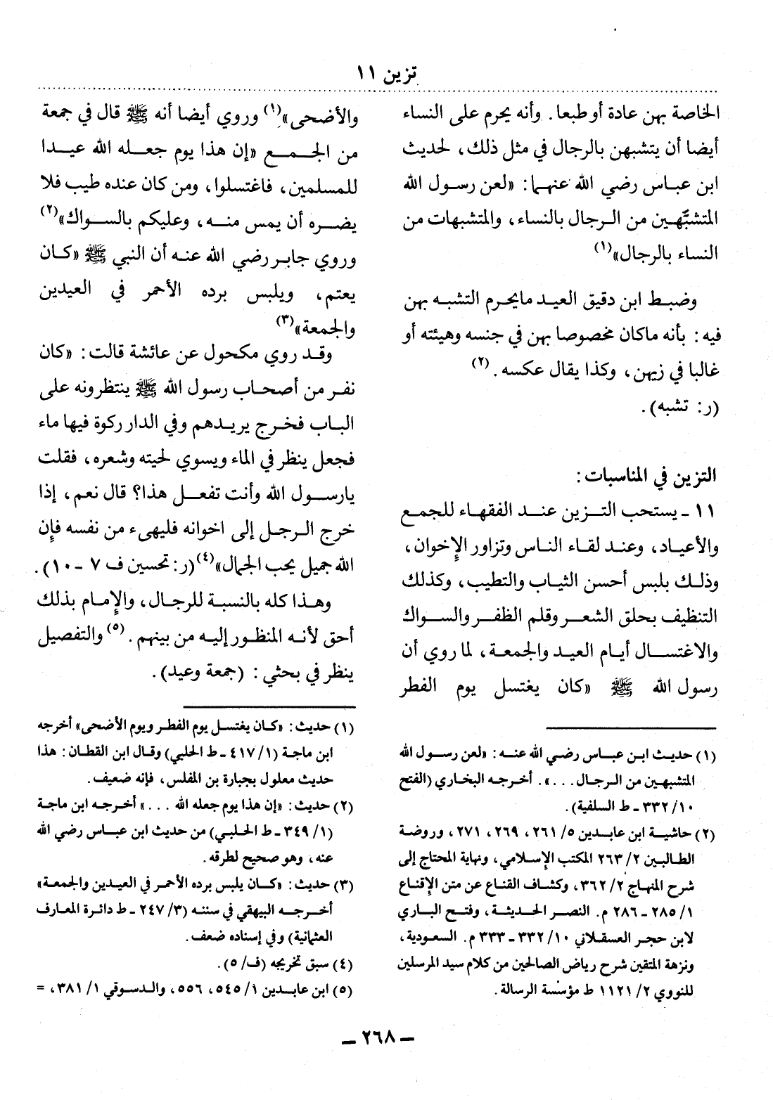 11 - يُسْتَحَبُّ التَّزَيُّنُ عِنْدَ الْفُقَهَاءِ لِلْجُمَعِ وَالأَْعْيَادِ، وَعِنْدَ لِقَاءِ النَّاسِ وَتَزَاوُرِ الإِْخْوَانِ. وَذَلِكَ بِلُبْسِ أَحْسَنِ الثِّيَابِ وَالتَّطَيُّبِ، وَكَذَلِكَ التَّنْظِيفُ بِحَلْقِ الشَّعْرِ وَقَلْمِ الظُّفْرِ وَالسِّوَاكِ وَالاِغْتِسَال أَيَّامَ الْعِيدِ وَالْجُمُعَةِ، لِمَا رُوِيَ أَنَّ رَسُول اللَّهِ صَلَّى اللَّهُ عَلَيْهِ وَسَلَّمَ كَانَ يَغْتَسِل يَوْمَ الْفِطْرِ