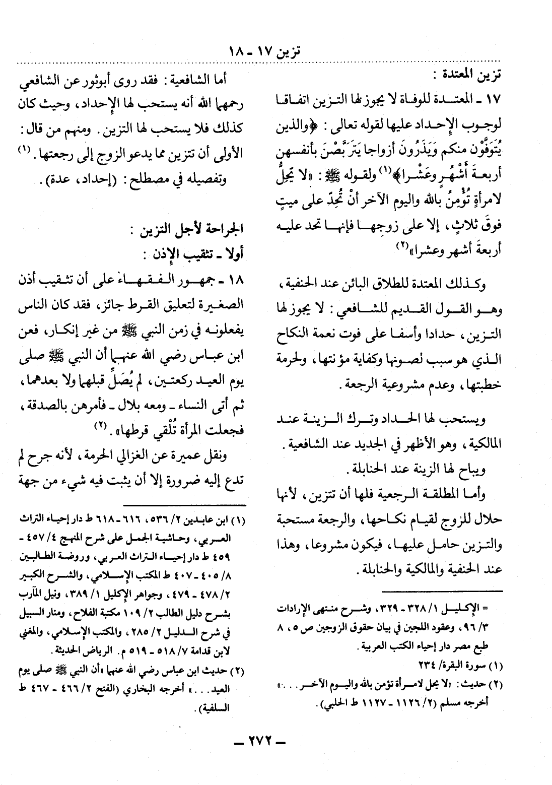 17 - الْمُعْتَدَّةُ لِلْوَفَاةِ لاَ يَجُوزُ لَهَا التَّزَيُّنُ اتِّفَاقًا لِوُجُوبِ الإِْحْدَادِ عَلَيْهَا لِقَوْلِهِ تَعَالَى: {وَالَّذِينَ يُتَوَفَّوْنَ مِنْكُمْ وَيَذَرُونَ أَزْوَاجًا يَتَرَبَّصْنَ بِأَنْفُسِهِنَّ أَرْبَعَةَ أَشْهُرٍ وَعَشْرًا} (1) وَلِقَوْلِهِ صَلَّى اللَّهُ عَلَيْهِ وَسَلَّمَ: لاَ يَحِل لاِمْرَأَةٍ تُؤْمِنُ بِاللَّهِ وَالْيَوْمِ الآْخِرِ أَنْ تُحِدَّ عَلَى مَيِّتٍ فَوْقَ ثَلاَثٍ، إِلاَّ عَلَى زَوْجِهَا فَإِنَّهَا تُحِدُّ عَلَيْهِ أَرْبَعَةَ أَشْهُرٍ وَعَشْرًا (2) .