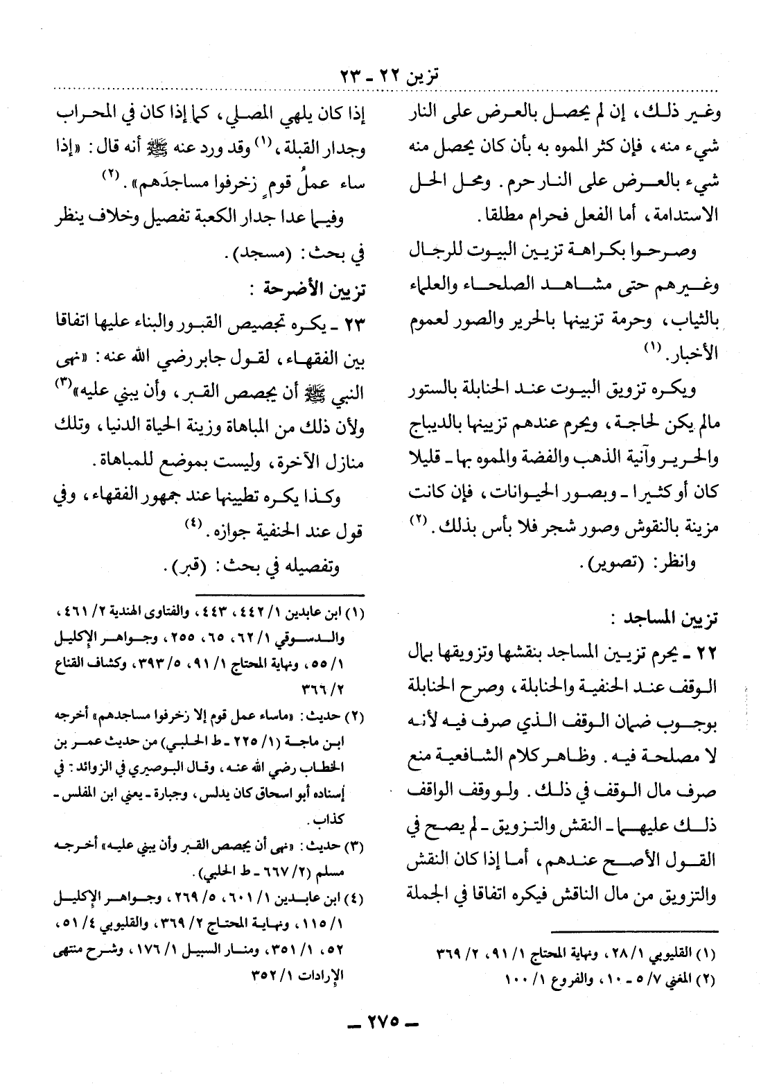 22 - يَحْرُمُ تَزْيِينُ الْمَسَاجِدِ بِنَقْشِهَا وَتَزْوِيقِهَا بِمَال الْوَقْفِ عِنْدَ الْحَنَفِيَّةِ وَالْحَنَابِلَةِ، وَصَرَّحَ الْحَنَابِلَةُ بِوُجُوبِ ضَمَانِ الْوَقْفِ الَّذِي صُرِفَ فِيهِ؛ لأَِنَّهُ لاَ مَصْلَحَةَ فِيهِ. وَظَاهِرُ كَلاَمِ الشَّافِعِيَّةِ مَنْعُ صَرْفِ مَال الْوَقْفِ فِي ذَلِكَ. وَلَوْ وَقَفَ الْوَاقِفُ ذَلِكَ عَلَيْهِمَا - النَّقْشِ وَالتَّزْوِيقِ - لَمْ يَصِحَّ فِي الْقَوْل الأَْصَحِّ عِنْدَهُمْ، أَمَّا إِذَا كَانَ النَّقْشُ وَالتَّزْوِيقُ مِنْ مَال النَّاقِشِ فَيُكْرَهُ اتِّفَاقًا فِي الْجُمْلَةِ