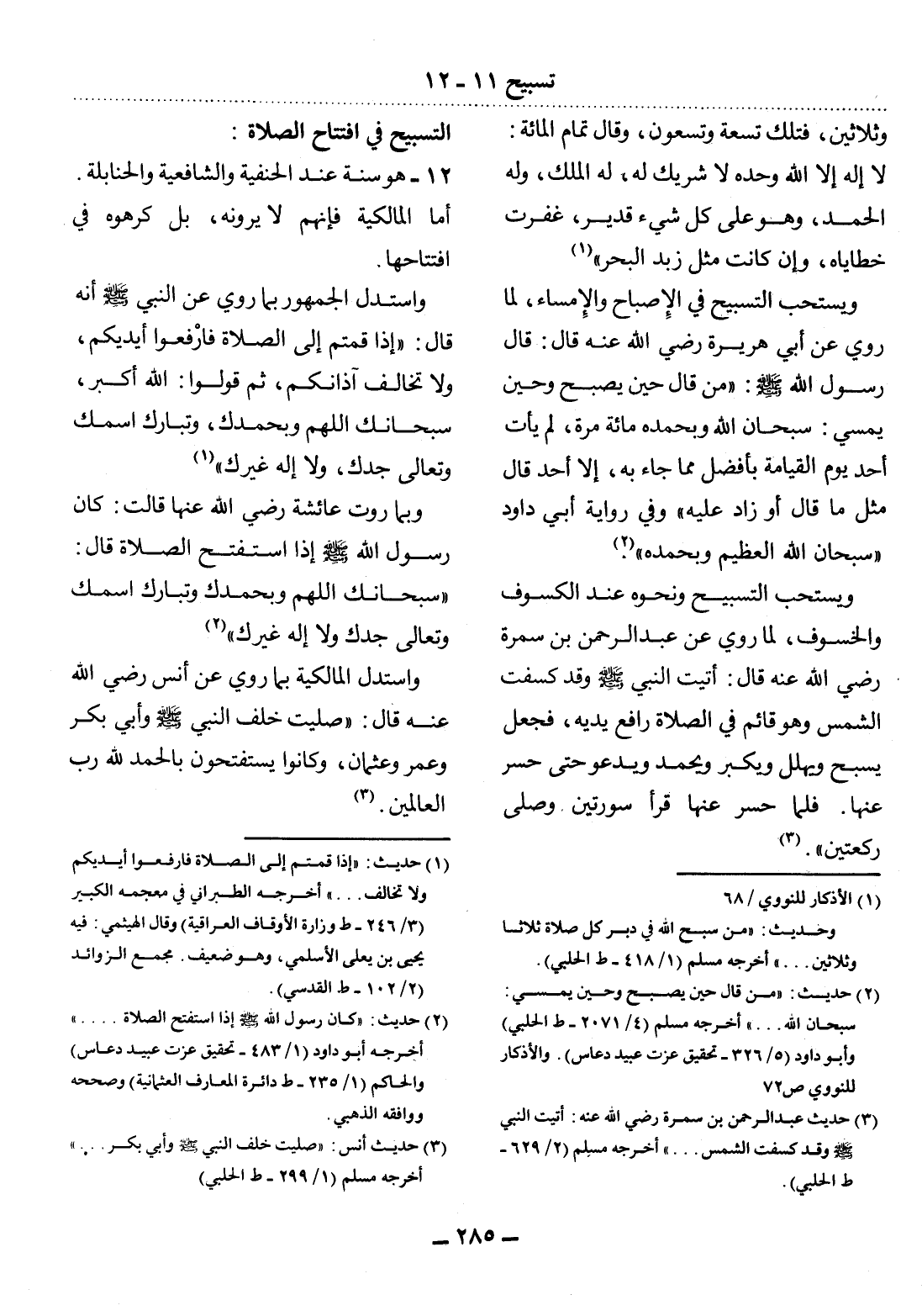 (1) الأذكار للنووي / 68. وحديث: " من سبح الله في دبر كل صلاة ثلاثا وثلاثين. . . " أخرجه مسلم (1 / 418 - ط الحلبي) .