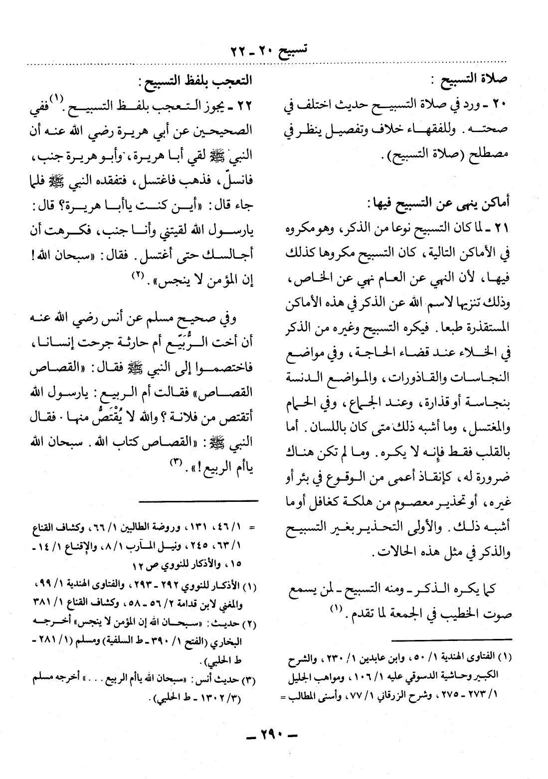22 - يَجُوزُ التَّعَجُّبُ بِلَفْظِ التَّسْبِيحِ (1) . فَفِي الصَّحِيحَيْنِ عَنْ أَبِي هُرَيْرَةَ رَضِيَ اللَّهُ عَنْهُ أَنَّ النَّبِيَّ صَلَّى اللَّهُ عَلَيْهِ وَسَلَّمَ لَقِيَ أَبَا هُرَيْرَةَ، وَأَبُو هُرَيْرَةَ جُنُبٌ، فَانْسَل، فَذَهَبَ فَاغْتَسَل، فَتَفَقَّدَهُ النَّبِيُّ صَلَّى اللَّهُ عَلَيْهِ وَسَلَّمَ فَلَمَّا جَاءَ قَال: أَيْنَ كُنْتَ يَا أَبَا هُرَيْرَةَ؟ قَال: يَا رَسُول اللَّهِ لَقِيتَنِي وَأَنَا جُنُبٌ، فَكَرِهْتُ أَنْ أُجَالِسَكَ حَتَّى أَغْتَسِل. فَقَال: سُبْحَانَ اللَّهِ، إِنَّ الْمُؤْمِنَ لاَ يَنْجُسُ. (2)