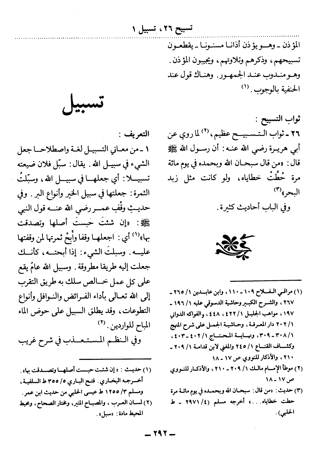 : 26 - ثَوَابُ التَّسْبِيحِ عَظِيمٌ، (2) لِمَا رُوِيَ عَنْ أَبِي هُرَيْرَةَ رَضِيَ اللَّهُ عَنْهُ: أَنَّ رَسُول اللَّهِ صَلَّى اللَّهُ عَلَيْهِ وَسَلَّمَ قَال: مَنْ قَال سُبْحَانَ اللَّهِ وَبِحَمْدِهِ فِي يَوْمٍ مِائَةَ مَرَّةٍ حُطَّتْ خَطَايَاهُ، وَلَوْ كَانَتْ مِثْل زَبَدِ الْبَحْرِ (3)