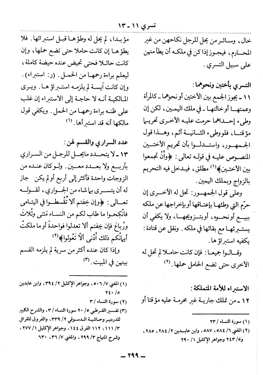 13 - لاَ يَتَحَدَّدُ مَا يَحِل لِلرَّجُل مِنَ السَّرَارِيِّ بِأَرْبَعٍ وَلاَ بِعَدَدٍ مُعَيَّنٍ. وَلَوْ كَانَ عِنْدَهُ مِنَ الزَّوْجَاتِ وَاحِدَةٌ فَأَكْثَرَ إِلَى أَرْبَعٍ أَوْ لَمْ يَكُنْ جَازَ لَهُ أَنْ يَتَسَرَّى بِمَا شَاءَ مِنَ الْجَوَارِي؛ لِقَوْلِهِ تَعَالَى: {وَإِنْ خِفْتُمْ أَلاَّ تُقْسِطُوا فِي الْيَتَامَى فَانْكِحُوا مَا طَابَ لَكُمْ مِنَ النِّسَاءِ مَثْنَى وَثُلاَثَ وَرُبَاعَ فَإِنْ خِفْتُمْ أَلاَّ تَعْدِلُوا فَوَاحِدَةً أَوْ مَا مَلَكَتْ أَيْمَانُكُمْ ذَلِكَ أَدْنَى أَلاَّ تَعُولُوا} (2)