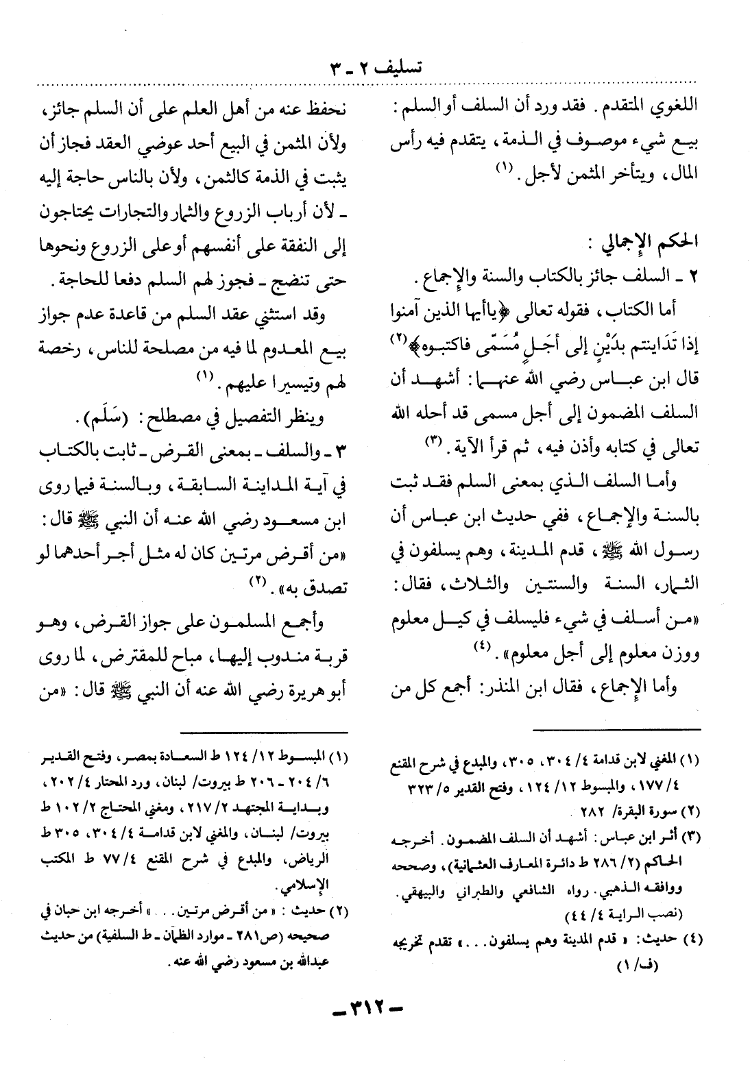 وَأَمَّا السَّلَفُ الَّذِي بِمَعْنَى السَّلَمِ فَقَدْ ثَبَتَ بِالسُّنَّةِ وَالإِْجْمَاعِ، فَفِي حَدِيثِ ابْنِ عَبَّاسٍ أَنَّ رَسُول اللَّهِ صَلَّى اللَّهُ عَلَيْهِ وَسَلَّمَ قَدِمَ الْمَدِينَةَ، وَهُمْ يُسْلِفُونَ فِي الثِّمَارِ، السَّنَةَ وَالسَّنَتَيْنِ وَالثَّلاَثَ، فَقَال: مَنْ أَسْلَفَ فِي شَيْءٍ فَلْيُسْلِفْ فِي كَيْلٍ مَعْلُومٍ وَوَزْنٍ مَعْلُومٍ إِلَى أَجَلٍ مَعْلُومٍ. (4)