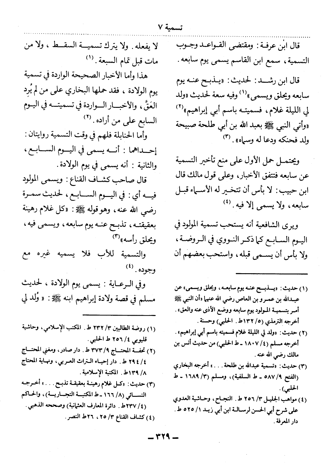 قَال ابْنُ رُشْدٍ: لِحَدِيثِ: يُذْبَحُ عَنْهُ يَوْمَ سَابِعِهِ وَيُحْلَقُ وَيُسَمَّى (1) وَفِيهِ سَعَةٌ لِحَدِيثِ وُلِدَ لِي اللَّيْلَةَ غُلاَمٌ، فَسَمَّيْتُهُ بِاسْمِ أَبِي إِبْرَاهِيمَ (2) وَأُتِيَ النَّبِيُّ صَلَّى اللَّهُ عَلَيْهِ وَسَلَّمَ بِعَبْدِ اللَّهِ بْنِ أَبِي طَلْحَةَ صَبِيحَةَ وُلِدَ فَحَنَّكَهُ وَدَعَا لَهُ وَسَمَّاهُ. (3)