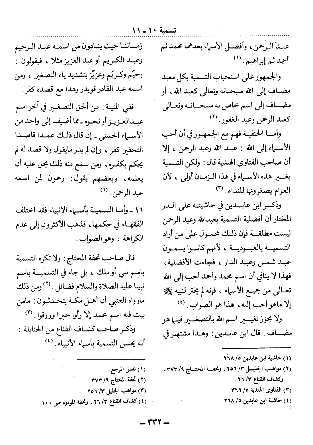 وَذَكَرَ ابْنُ عَابِدِينَ فِي حَاشِيَتِهِ عَلَى الدُّرِّ الْمُخْتَارِ أَنَّ أَفْضَلِيَّةَ التَّسْمِيَةِ بِعَبْدِ اللَّهِ وَعَبْدِ الرَّحْمَنِ لَيْسَتْ مُطْلَقَةً فَإِنَّ ذَلِكَ مَحْمُولٌ عَلَى مَنْ أَرَادَ التَّسْمِيَةَ بِالْعُبُودِيَّةِ؛ لأَِنَّهُمْ كَانُوا يُسَمُّونَ عَبْدَ شَمْسٍ وَعَبْدَ الدَّارِ، فَجَاءَتِ الأَْفْضَلِيَّةُ، فَهَذَا لاَ يُنَافِي أَنَّ اسْمَ مُحَمَّدٍ وَأَحْمَدَ أَحَبُّ إِلَى اللَّهِ تَعَالَى مِنْ جَمِيعِ الأَْسْمَاءِ، فَإِنَّهُ لَمْ يَخْتَرْ لِنَبِيِّهِ صَلَّى اللَّهُ عَلَيْهِ وَسَلَّمَ إِلاَّ مَا هُوَ أَحَبُّ إِلَيْهِ، هَذَا هُوَ الصَّوَابُ. (4)