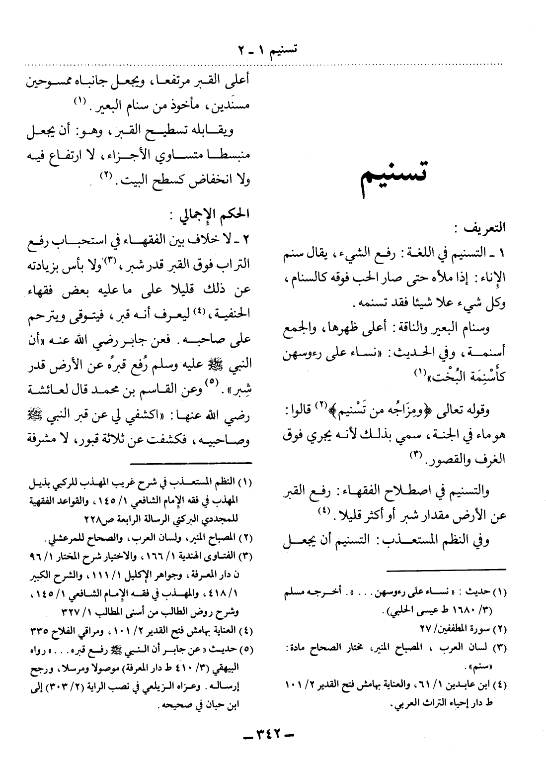 وَالتَّسْنِيمُ فِي اصْطِلاَحِ الْفُقَهَاءِ: رَفْعُ الْقَبْرِ عَنِ الأَْرْضِ مِقْدَارَ شِبْرٍ أَوْ أَكْثَرَ قَلِيلاً. (4)