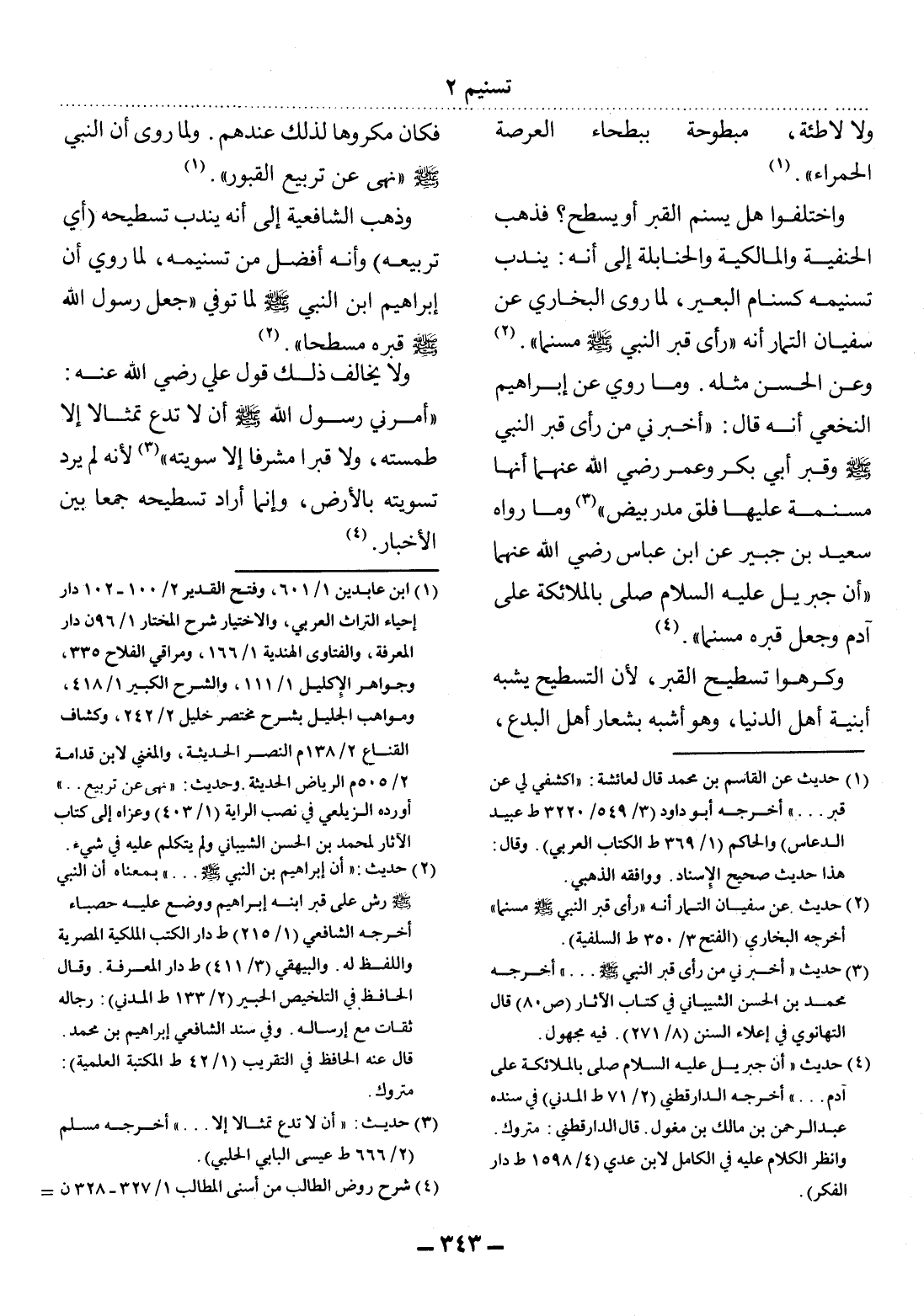 وَاخْتَلَفُوا هَل يُسَنَّمُ الْقَبْرُ أَوْ يُسَطَّحُ؟ فَذَهَبَ الْحَنَفِيَّةُ وَالْمَالِكِيَّةُ وَالْحَنَابِلَةُ إِلَى أَنَّهُ: يُنْدَبُ تَسْنِيمُهُ كَسَنَامِ الْبَعِيرِ؛ لِمَا رَوَى الْبُخَارِيُّ عَنْ سُفْيَانَ التَّمَّارِ أَنَّهُ رَأَى قَبْرَ النَّبِيِّ صَلَّى اللَّهُ عَلَيْهِ وَسَلَّمَ مُسَنَّمًا (2) .