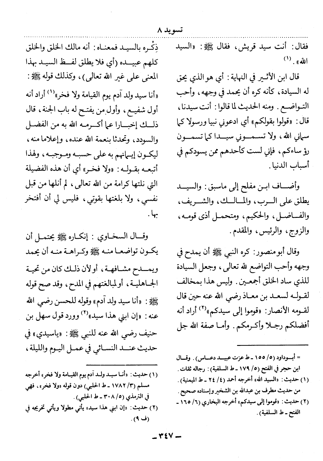 (1) حديث: " أنا سيد ولد آدم يوم القيامة ولا فخر " أخرجه مسلم (3 / 1782 - ط الحلبي) دون قوله " ولا فخر "، فهي في الترمذي (5 / 308 - ط الحلبي) .