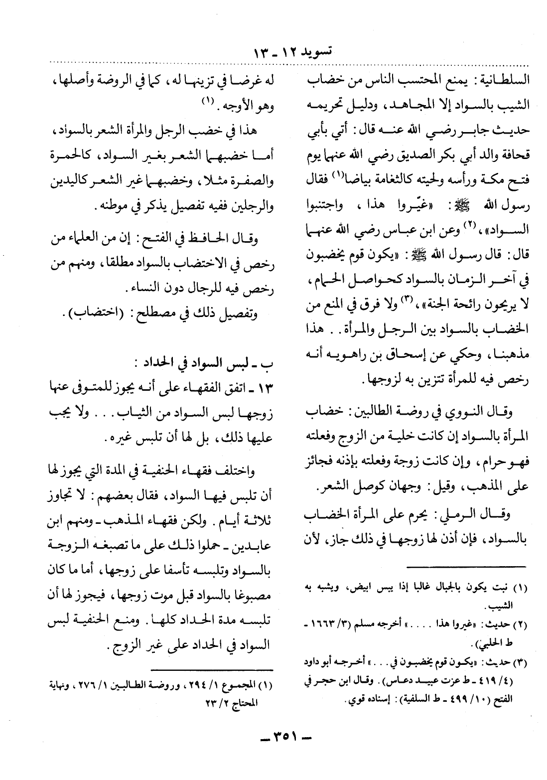 وَقَال النَّوَوِيُّ فِي رَوْضَةِ الطَّالِبِينَ: خِضَابُ الْمَرْأَةِ بِالسَّوَادِ إِنْ كَانَتْ خَلِيَّةً مِنَ الزَّوْجِ وَفَعَلَتْهُ فَهُوَ حَرَامٌ، وَإِنْ كَانَتْ زَوْجَةً وَفَعَلَتْهُ بِإِذْنِهِ فَجَائِزٌ عَلَى الْمَذْهَبِ، وَقِيل: وَجْهَانِ كَوَصْل الشَّعْرِ.