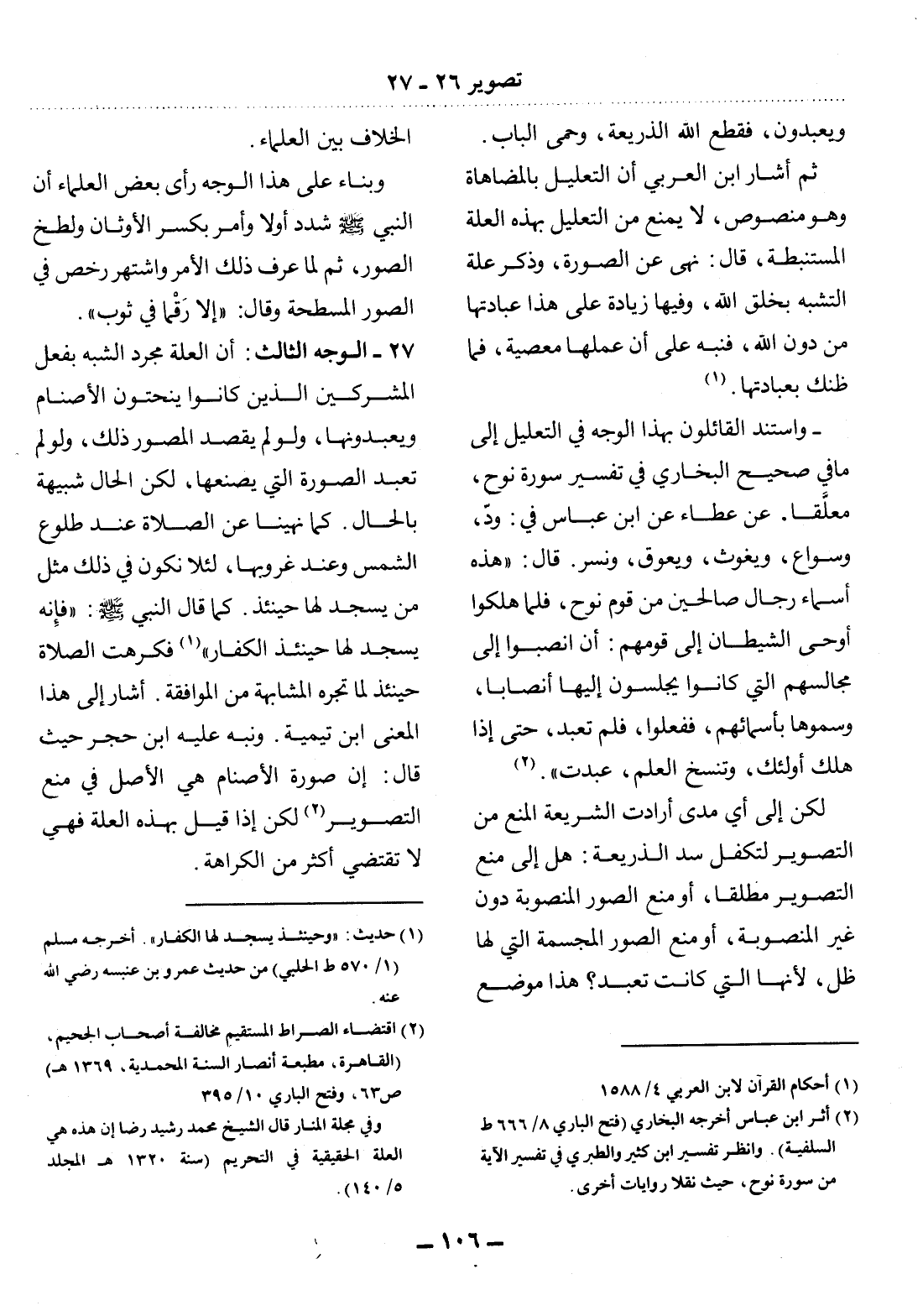 27 - الْوَجْهُ الثَّالِثُ: أَنَّ الْعِلَّةَ مُجَرَّدُ الشَّبَهِ بِفِعْل الْمُشْرِكِينَ الَّذِينَ كَانُوا يَنْحِتُونَ الأَْصْنَامَ وَيَعْبُدُونَهَا، وَلَوْ لَمْ يَقْصِدِ الْمُصَوِّرُ ذَلِكَ، وَلَوْ لَمْ تُعْبَدِ الصُّورَةُ الَّتِي يَصْنَعُهَا، لَكِنَّ الْحَال شَبِيهَةٌ بِالْحَال. كَمَا نُهِينَا عَنِ الصَّلاَةِ عِنْدَ طُلُوعِ الشَّمْسِ وَعِنْدَ غُرُوبِهَا؛ لِئَلاَّ نَكُونَ فِي ذَلِكَ مِثْل مَنْ يَسْجُدُ لَهَا حِينَئِذٍ. كَمَا قَال النَّبِيُّ صَلَّى اللَّهُ عَلَيْهِ وَسَلَّمَ: فَإِِنَّهُ يَسْجُدُ لَهَا حِينَئِذٍ الْكُفَّارُ (1) فَكُرِهَتِ الصَّلاَةُ حِينَئِذٍ لِمَا تَجُرُّهُ الْمُشَابَهَةُ مِنَ الْمُوَافَقَةِ. أَشَارَ إِِلَى هَذَا الْمَعْنَى ابْنُ تَيْمِيَّةَ. وَنَبَّهَ عَلَيْهِ ابْنُ حَجَرٍ حَيْثُ قَال: إِنَّ صُورَةَ الأَْصْنَامِ هِيَ الأَْصْل فِي مَنْعِ التَّصْوِيرِ (2) لَكِنْ إِِذَا قِيل بِهَذِهِ الْعِلَّةِ فَهِيَ لاَ تَقْتَضِي أَكْثَرَ مِنَ الْكَرَاهَةِ.