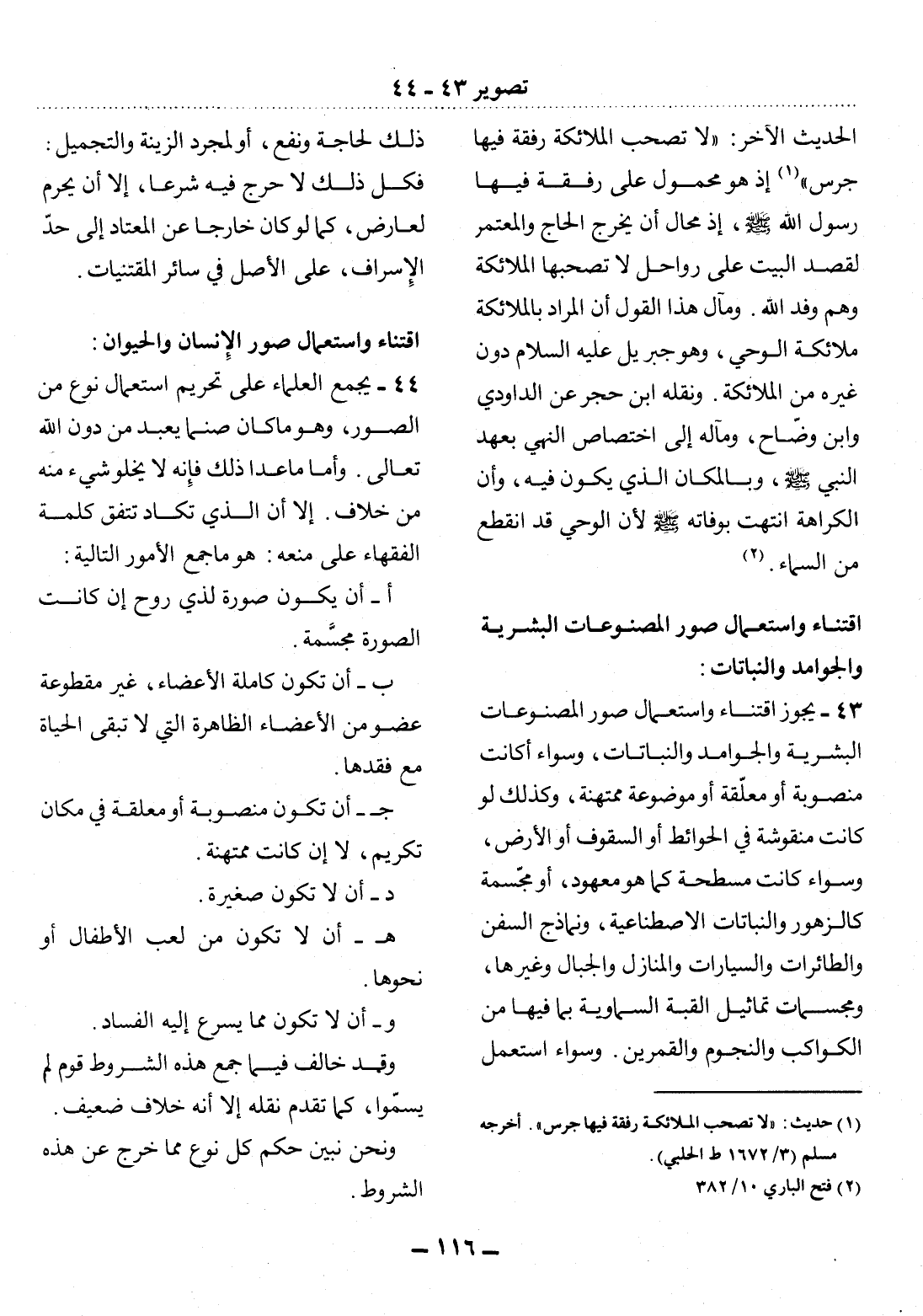 43 - يَجُوزُ اقْتِنَاءُ وَاسْتِعْمَال صُوَرِ الْمَصْنُوعَاتِ الْبَشَرِيَّةِ وَالْجَوَامِدِ وَالنَّبَاتَاتِ، وَسَوَاءٌ أَكَانَتْ مَنْصُوبَةً أَوْ مُعَلَّقَةً أَوْ مَوْضُوعَةً مُمْتَهَنَةً، وَكَذَلِكَ لَوْ كَانَتْ مَنْقُوشَةً فِي الْحَوَائِطِ أَوِ السُّقُوفِ أَوِ الأَْرْضِ، وَسَوَاءٌ كَانَتْ مُسَطَّحَةً كَمَا هُوَ مَعْهُودٌ، أَوْ مُجَسَّمَةً كَالزُّهُورِ وَالنَّبَاتَاتِ الاِصْطِنَاعِيَّةِ، وَنَمَاذِجِ السُّفُنِ وَالطَّائِرَاتِ وَالسَّيَّارَاتِ وَالْمَنَازِل وَالْجِبَال وَغَيْرِهَا، وَمُجَسَّمَاتِ تَمَاثِيل الْقُبَّةِ السَّمَاوِيَّةِ بِمَا فِيهَا مِنَ الْكَوَاكِبِ وَالنُّجُومِ وَالْقَمَرَيْنِ. وَسَوَاءٌ اسْتُعْمِل