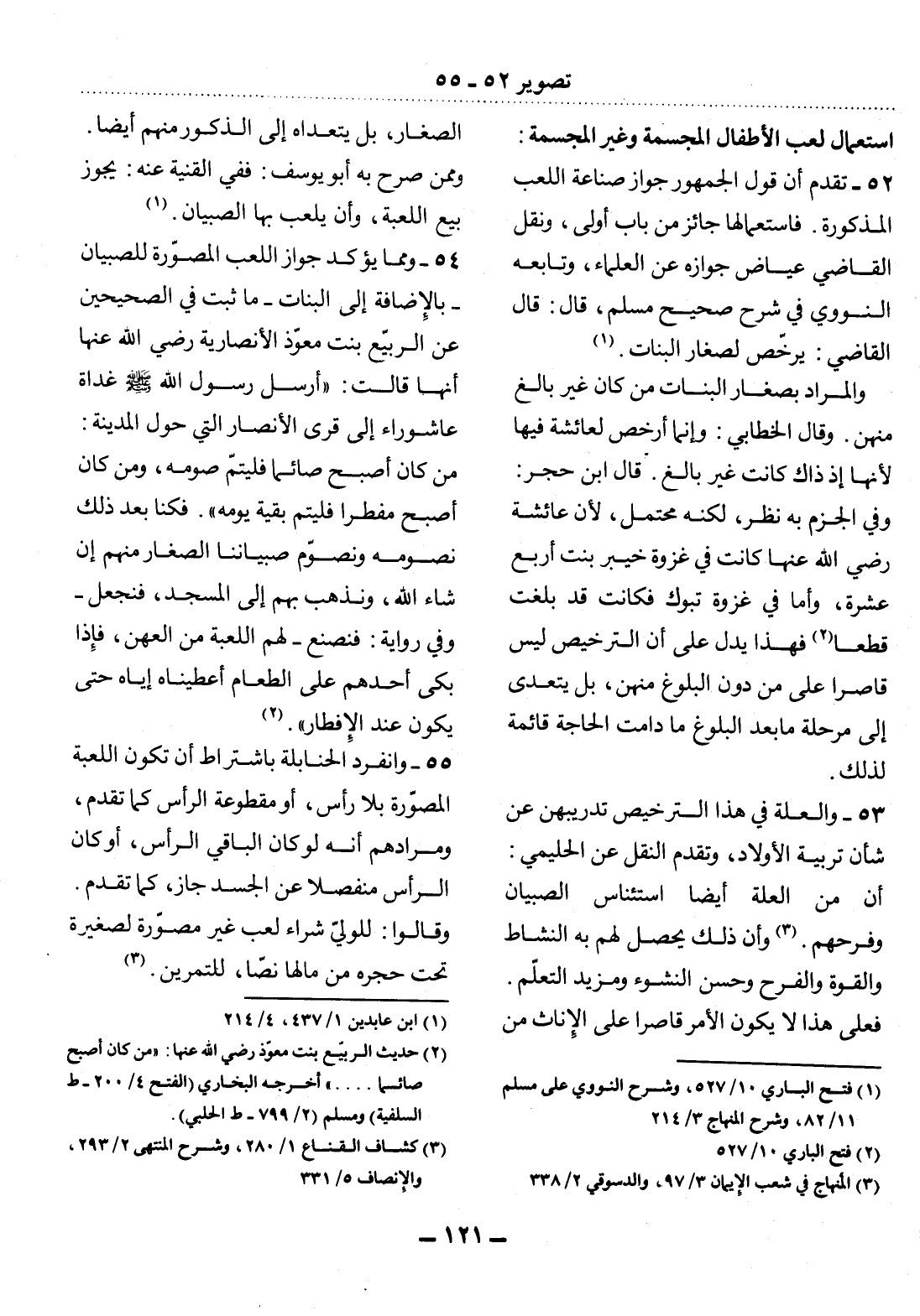 54 - وَمِمَّا يُؤَكِّدُ جَوَازَ اللُّعَبِ الْمُصَوَّرَةِ لِلصِّبْيَانِ - بِالإِِْضَافَةِ إِِلَى الْبَنَاتِ - مَا ثَبَتَ فِي الصَّحِيحَيْنِ عَنِ الرُّبَيِّعِ بِنْتِ مُعَوِّذٍ الأَْنْصَارِيَّةِ رَضِيَ اللَّهُ عَنْهَا أَنَّهَا قَالَتْ: أَرْسَل رَسُول اللَّهِ صَلَّى اللَّهُ عَلَيْهِ وَسَلَّمَ غَدَاةَ عَاشُورَاءَ إِِلَى قُرَى الأَْنْصَارِ الَّتِي حَوْل الْمَدِينَةِ: مَنْ كَانَ أَصْبَحَ صَائِمًا فَلْيُتِمَّ صَوْمَهُ، وَمَنْ كَانَ أَصْبَحَ مُفْطِرًا فَلْيُتِمَّ بَقِيَّةَ يَوْمِهِ. فَكُنَّا بَعْدَ ذَلِكَ نَصُومُهُ وَنُصَوِّمُ صِبْيَانَنَا الصِّغَارَ مِنْهُمْ إِنْ شَاءَ اللَّهُ، وَنَذْهَبُ بِهِمْ إِِلَى الْمَسْجِدِ، فَنَجْعَل - وَفِي رِوَايَةٍ: فَنَصْنَعُ - لَهُمُ اللُّعْبَةَ مِنَ الْعِهْنِ، فَإِِذَا بَكَى أَحَدُهُمْ عَلَى الطَّعَامِ أَعْطَيْنَاهُ إِيَّاهُ حَتَّى يَكُونَ عِنْدَ الإِِْفْطَارِ. (2)