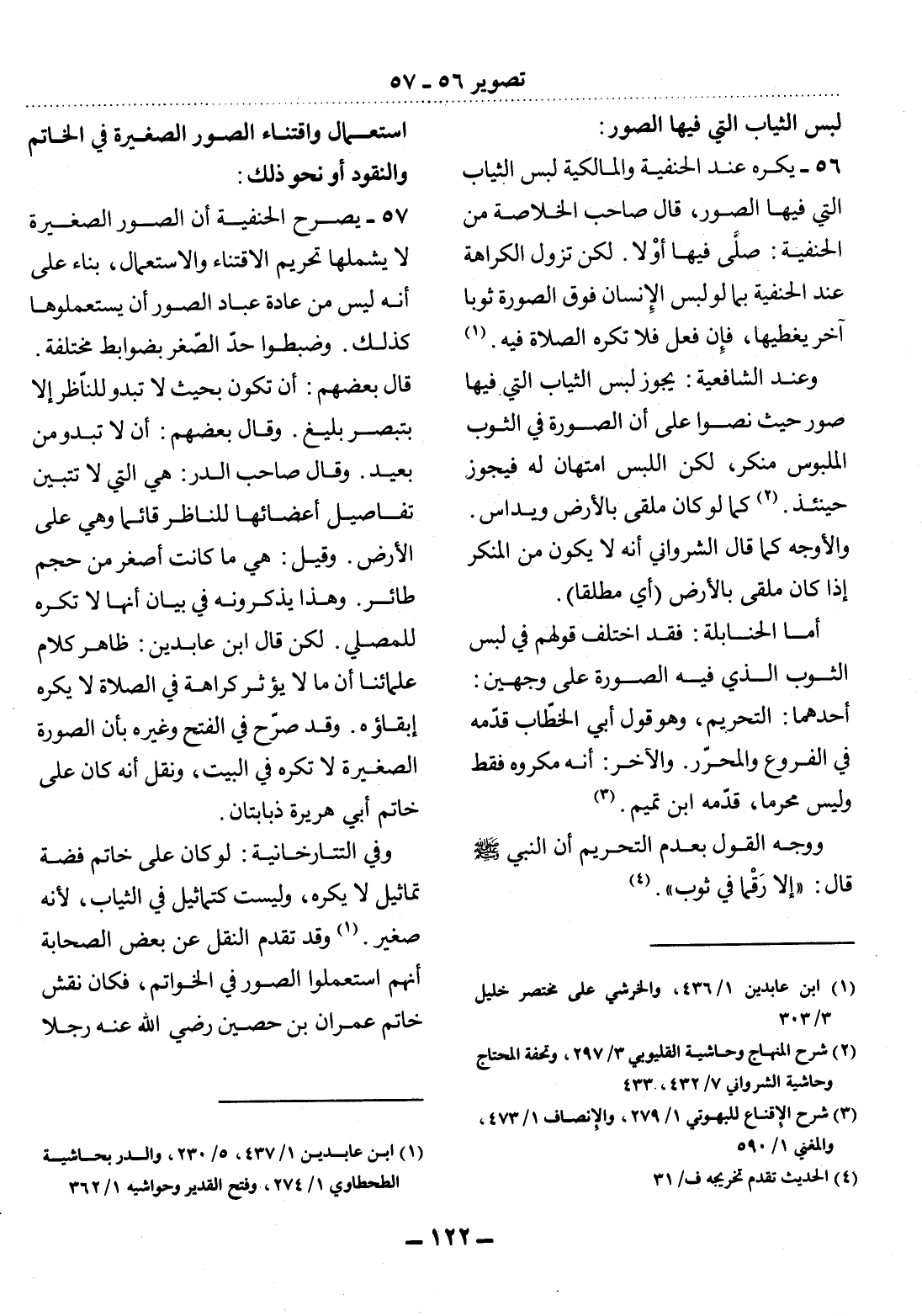57 - يُصَرِّحُ الْحَنَفِيَّةُ أَنَّ الصُّوَرَ الصَّغِيرَةَ لاَ يَشْمَلُهَا تَحْرِيمُ الاِقْتِنَاءِ وَالاِسْتِعْمَال، بِنَاءً عَلَى أَنَّهُ لَيْسَ مِنْ عَادَةِ عُبَّادِ الصُّوَرِ أَنْ يَسْتَعْمِلُوهَا كَذَلِكَ. وَضَبَطُوا حَدَّ الصِّغَرِ بِضَوَابِطَ مُخْتَلِفَةٍ.