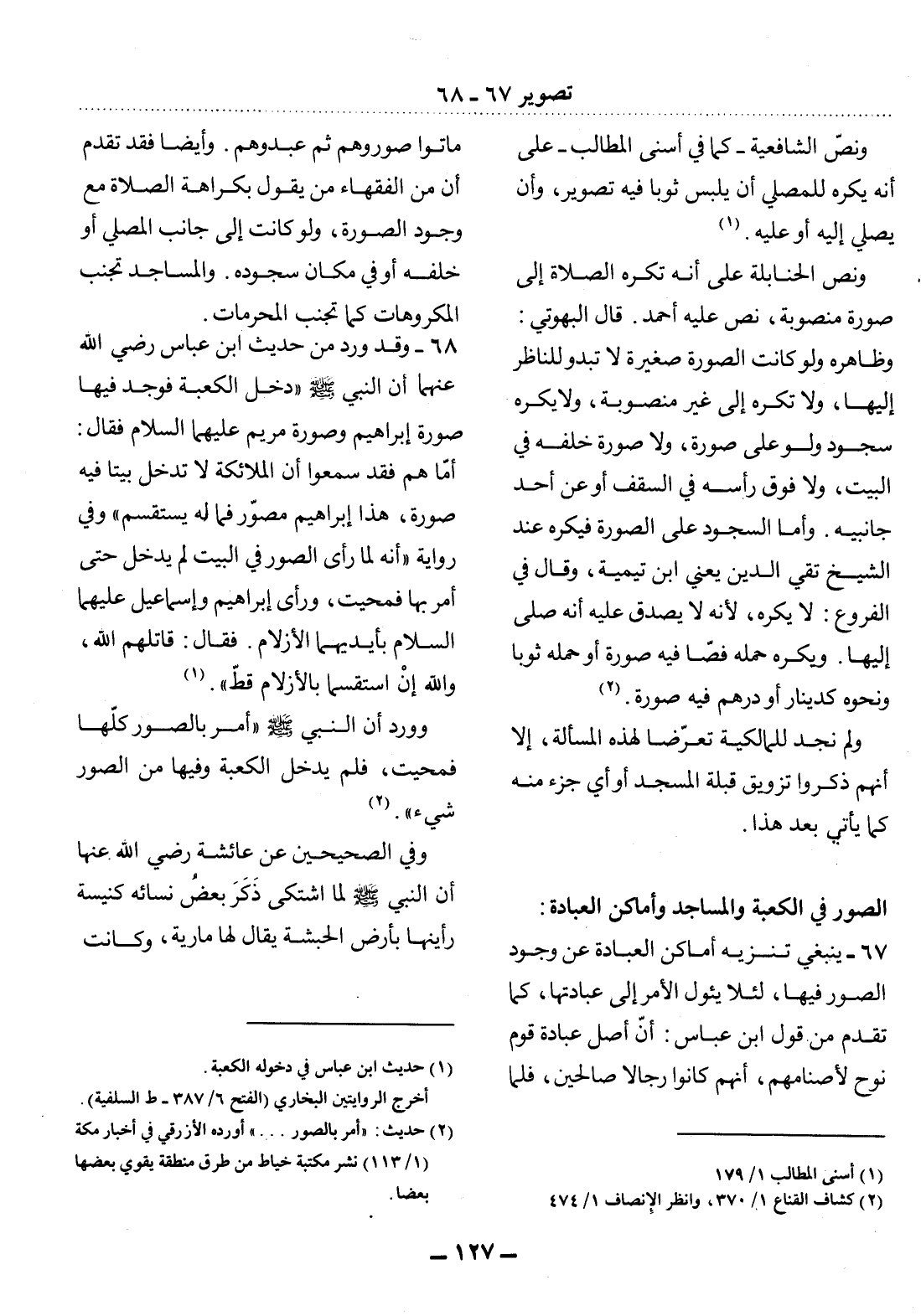 67 - يَنْبَغِي تَنْزِيهُ أَمَاكِنِ الْعِبَادَةِ عَنْ وُجُودِ الصُّوَرِ فِيهَا، لِئَلاَّ يَئُول الأَْمْرُ إِِلَى عِبَادَتِهَا، كَمَا تَقَدَّمَ مِنْ قَوْل ابْنِ عَبَّاسٍ: أَنَّ أَصْل عِبَادَةِ قَوْمِ نُوحٍ لأَِصْنَامِهِمْ، أَنَّهُمْ كَانُوا رِجَالاً صَالِحِينَ، فَلَمَّا