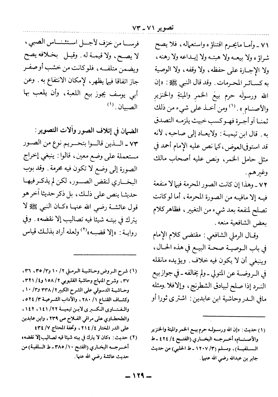 73 - الَّذِينَ قَالُوا بِتَحْرِيمِ نَوْعٍ مِنَ الصُّوَرِ مُسْتَعْمَلَةً عَلَى وَضْعٍ مُعَيَّنٍ، قَالُوا: يَنْبَغِي إِخْرَاجُ الصُّورَةِ إِِلَى وَضْعٍ لاَ تَكُونُ فِيهِ مُحَرَّمَةً. وَقَدْ بَوَّبَ الْبُخَارِيُّ لِنَقْضِ الصُّوَرِ، لَكِنْ لَمْ يَذْكُرْ فِيهَا حَدِيثًا يَنُصُّ عَلَى ذَلِكَ، بَل ذَكَرَ حَدِيثًا آخَرَ هُوَ قَوْل عَائِشَةَ رَضِيَ اللَّهُ عَنْهَا كَانَ النَّبِيُّ صَلَّى اللَّهُ عَلَيْهِ وَسَلَّمَ لاَ يَتْرُكُ فِي بَيْتِهِ شَيْئًا فِيهِ تَصَالِيبُ إِلاَّ نَقَضَهُ. وَفِي رِوَايَةٍ: إِلاَّ قَضَبَهُ (2) وَلَعَلَّهُ أَرَادَ بِذَلِكَ قِيَاسَ