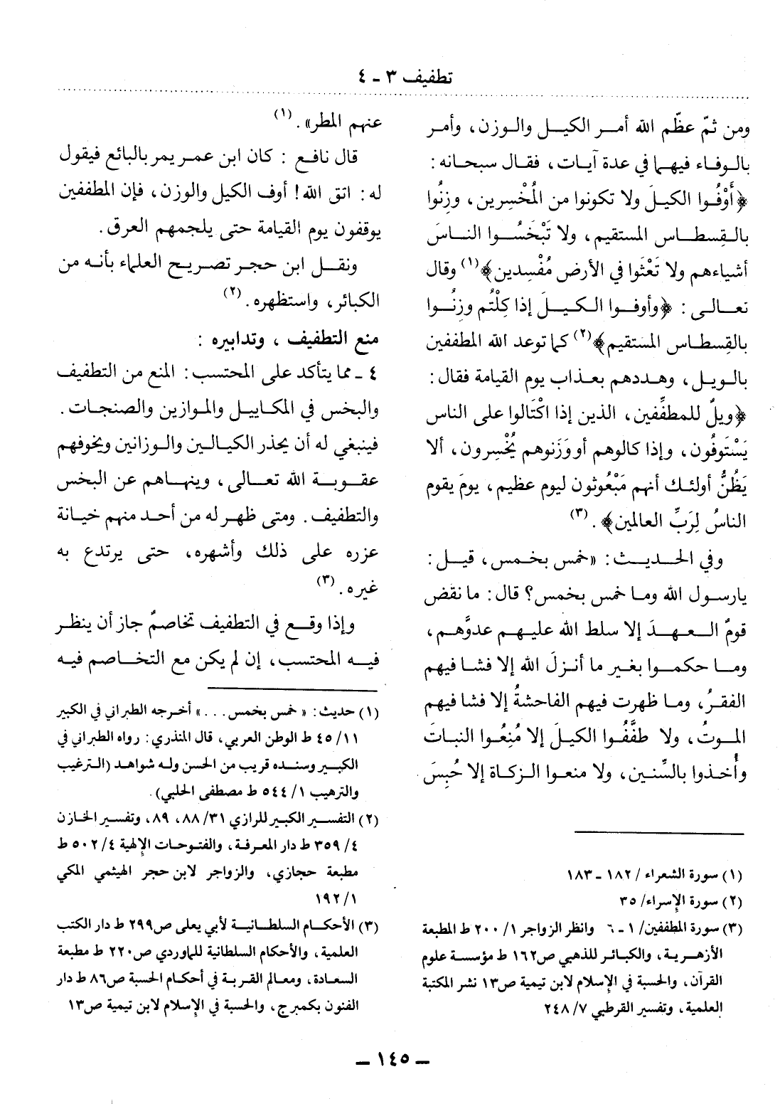 (3) سورة المطففين / 1 - 6، وانظر الزواجر 1 / 200 ط المطبعة الأزهرية، والكبائر للذهبي ص 162 ط مؤسسة علوم القرآن، والحسبة في الإسلام لابن تيمية ص 13 نشر المكتبة العلمية، وتفسير القرطبي 7 / 248.