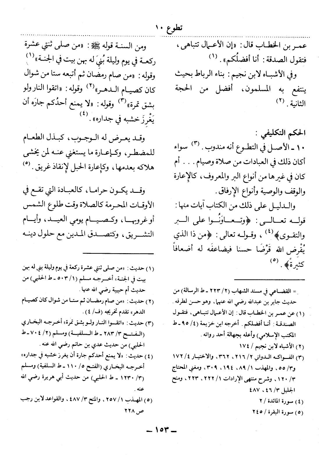 10 - الأَْصْل فِي التَّطَوُّعِ أَنَّهُ مَنْدُوبٌ (3) . سَوَاءٌ أَكَانَ ذَلِكَ فِي الْعِبَادَاتِ مِنْ صَلاَةٍ وَصِيَامٍ. . . أَمْ كَانَ فِي غَيْرِهَا مِنْ أَنْوَاعِ الْبِرِّ وَالْمَعْرُوفِ، كَالإِِْعَارَةِ وَالْوَقْفِ وَالْوَصِيَّةِ وَأَنْوَاعِ الإِِْرْفَاقِ.