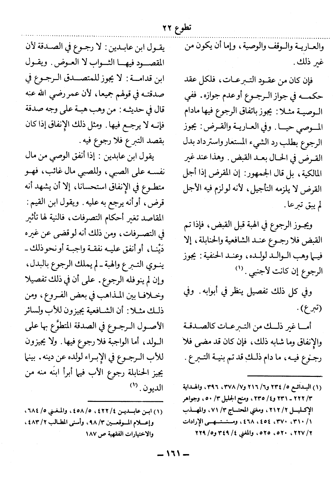 يَقُول ابْنُ عَابِدِينَ: لاَ رُجُوعَ فِي الصَّدَقَةِ لأَِنَّ الْمَقْصُودَ فِيهَا الثَّوَابُ لاَ الْعِوَضُ. وَيَقُول ابْنُ قُدَامَةَ: لاَ يَجُوزُ لِلْمُتَصَدِّقِ الرُّجُوعُ فِي صَدَقَتِهِ فِي قَوْلِهِمْ جَمِيعًا، لأَِنَّ عُمَرَ رَضِيَ اللَّهُ عَنْهُ قَال فِي حَدِيثِهِ: مَنْ وَهَبَ هِبَةً عَلَى وَجْهِ صَدَقَةٍ فَإِِنَّهُ لاَ يَرْجِعُ فِيهَا. وَمِثْل ذَلِكَ الإِِْنْفَاقُ إِِذَا كَانَ بِقَصْدِ التَّبَرُّعِ فَلاَ رُجُوعَ فِيهِ.