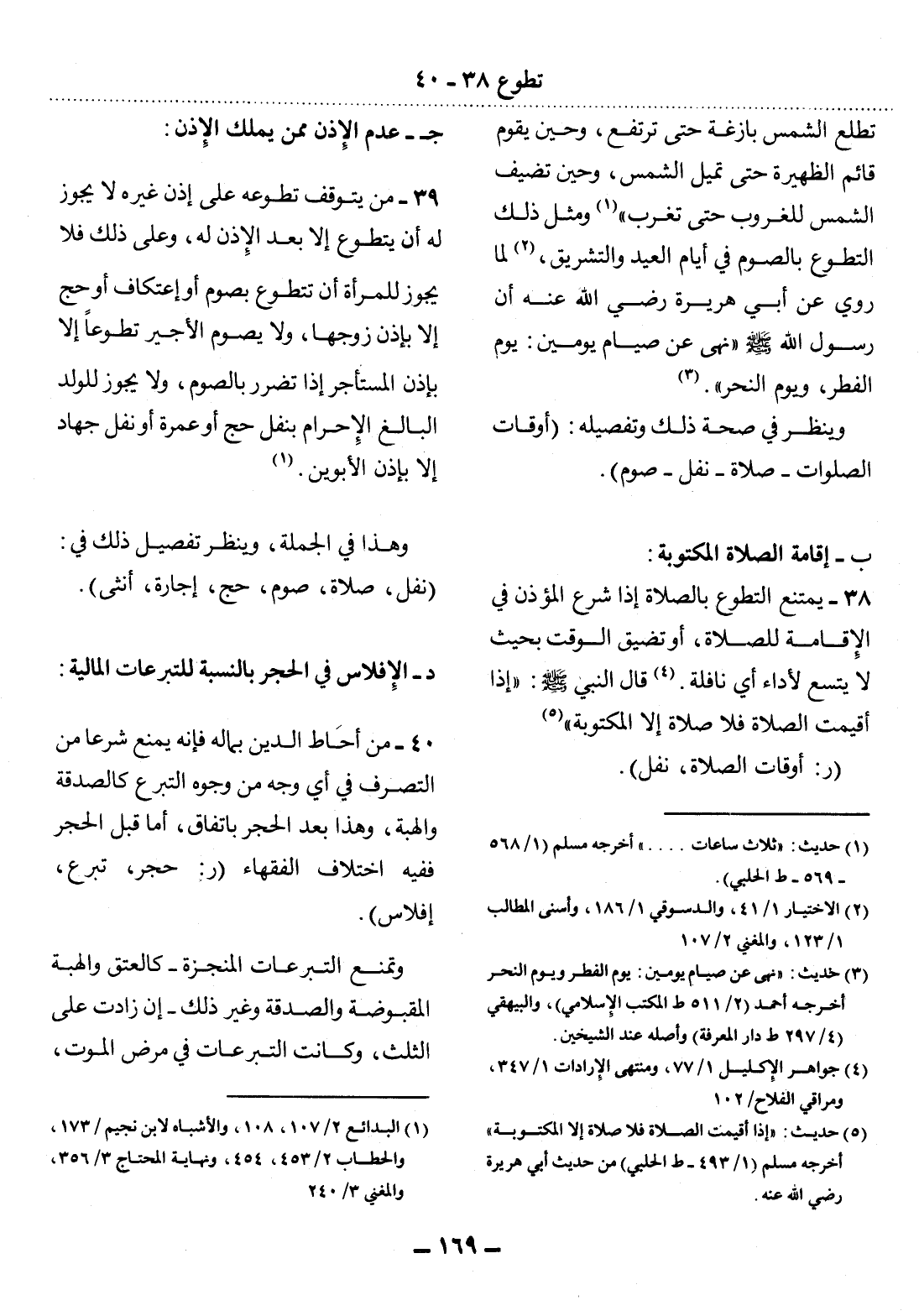 39 - مَنْ يَتَوَقَّفُ تَطَوُّعُهُ عَلَى إِذْنِ غَيْرِهِ لاَ يَجُوزُ لَهُ أَنْ يَتَطَوَّعَ إِلاَّ بَعْدَ الإِِْذْنِ لَهُ، وَعَلَى ذَلِكَ فَلاَ يَجُوزُ لِلْمَرْأَةِ أَنْ تَتَطَوَّعَ بِصَوْمٍ أَوِ اعْتِكَافٍ أَوْ حَجٍّ إِلاَّ بِإِِذْنِ زَوْجِهَا، وَلاَ يَصُومُ الأَْجِيرُ تَطَوُّعًا إِلاَّ بِإِِذْنِ الْمُسْتَأْجِرِ إِِذَا تَضَرَّرَ بِالصَّوْمِ، وَلاَ يَجُوزُ لِلْوَلَدِ الْبَالِغِ الإِِْحْرَامُ بِنَفْل حَجٍّ أَوْ عُمْرَةٍ أَوْ نَفْل جِهَادٍ إِلاَّ بِإِِذْنِ الأَْبَوَيْنِ (1) .