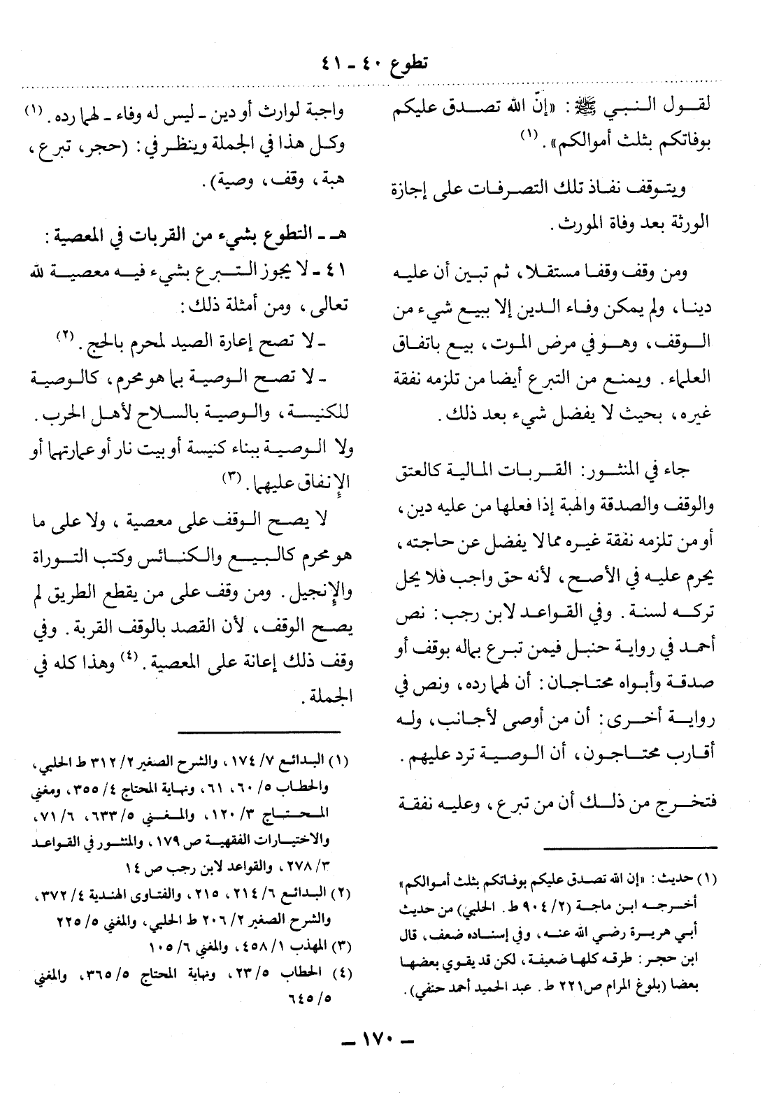 (1) حديث: " إن الله تصدق عليكم بوفاتكم بثلث أموالكم " أخرجه ابن ماجه (2 / 904 ط. الحلبي) من حديث أبي هريرة رضي الله عنه، وفي إسناده ضعف، قال ابن حجر: طرقه كلها ضعيفة، لكن قد يقوي بعضها بعضا (بلوغ المرام ص 221 ط. عبد الحميد أحمد حنفي) .