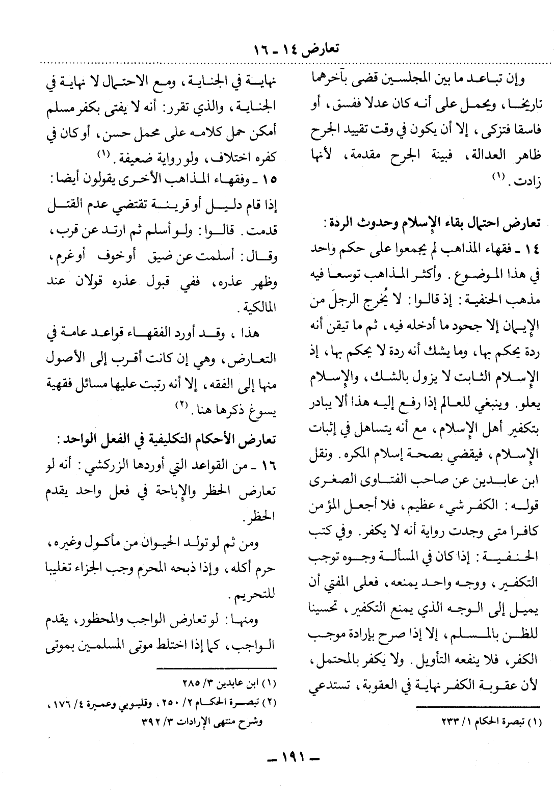 هَذَا، وَقَدْ أَوْرَدَ الْفُقَهَاءُ قَوَاعِدَ عَامَّةً فِي التَّعَارُضِ، وَهِيَ إِنْ كَانَتْ أَقْرَب إِِلَى الأُْصُول مِنْهَا إِِلَى الْفِقْهِ، إِلاَّ أَنَّهُ رُتِّبَتْ عَلَيْهَا مَسَائِل فِقْهِيَّةٌ يَسُوغُ ذِكْرُهَا هُنَا (2) .