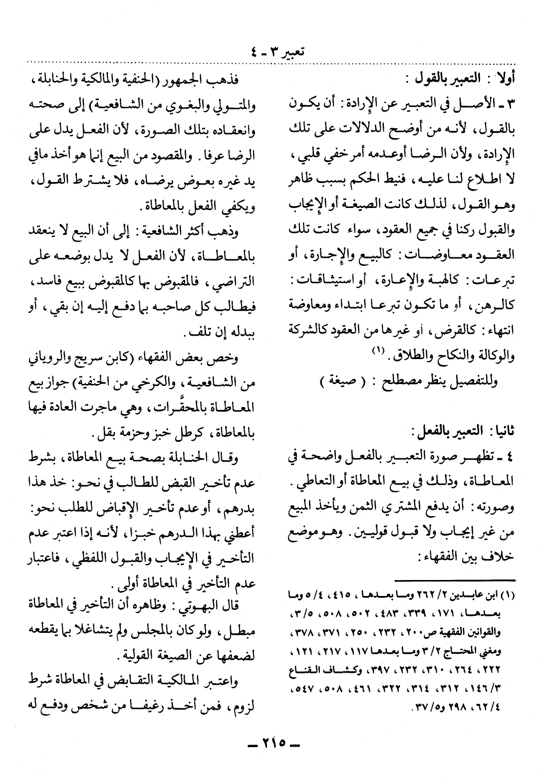 3 - الأَْصْل فِي التَّعْبِيرِ عَنِ الإِِْرَادَةِ: أَنْ يَكُونَ بِالْقَوْل؛ لأَِنَّهُ مِنْ أَوْضَحِ الدَّلاَلاَتِ عَلَى تِلْكَ الإِِْرَادَةِ؛ وَلأَِنَّ الرِّضَا أَوْ عَدَمَهُ أَمْرٌ خَفِيٌّ قَلْبِيٌّ، لاَ اطِّلاَعَ لَنَا عَلَيْهِ، فَنِيطَ الْحُكْمُ بِسَبَبٍ ظَاهِرٍ وَهُوَ الْقَوْل، لِذَلِكَ كَانَتِ الصِّيغَةُ أَوِ الإِِْيجَابُ وَالْقَبُول رُكْنًا فِي جَمِيعِ الْعُقُودِ، سَوَاءٌ كَانَتْ تِلْكَ الْعُقُودُ مُعَاوَضَاتٍ: كَالْبَيْعِ وَالإِِْجَارَةِ، أَوْ تَبَرُّعَاتٍ: كَالْهِبَةِ وَالإِِْعَارَةِ، أَوِ اسْتِيثَاقَاتٍ: كَالرَّهْنِ، أَوْ مَا تَكُونُ تَبَرُّعًا ابْتِدَاءً وَمُعَاوَضَةً انْتِهَاءً: كَالْقَرْضِ، أَوْ غَيْرِهَا مِنَ الْعُقُودِ كَالشَّرِكَةِ وَالْوَكَالَةِ وَالنِّكَاحِ وَالطَّلاَقِ. (1)