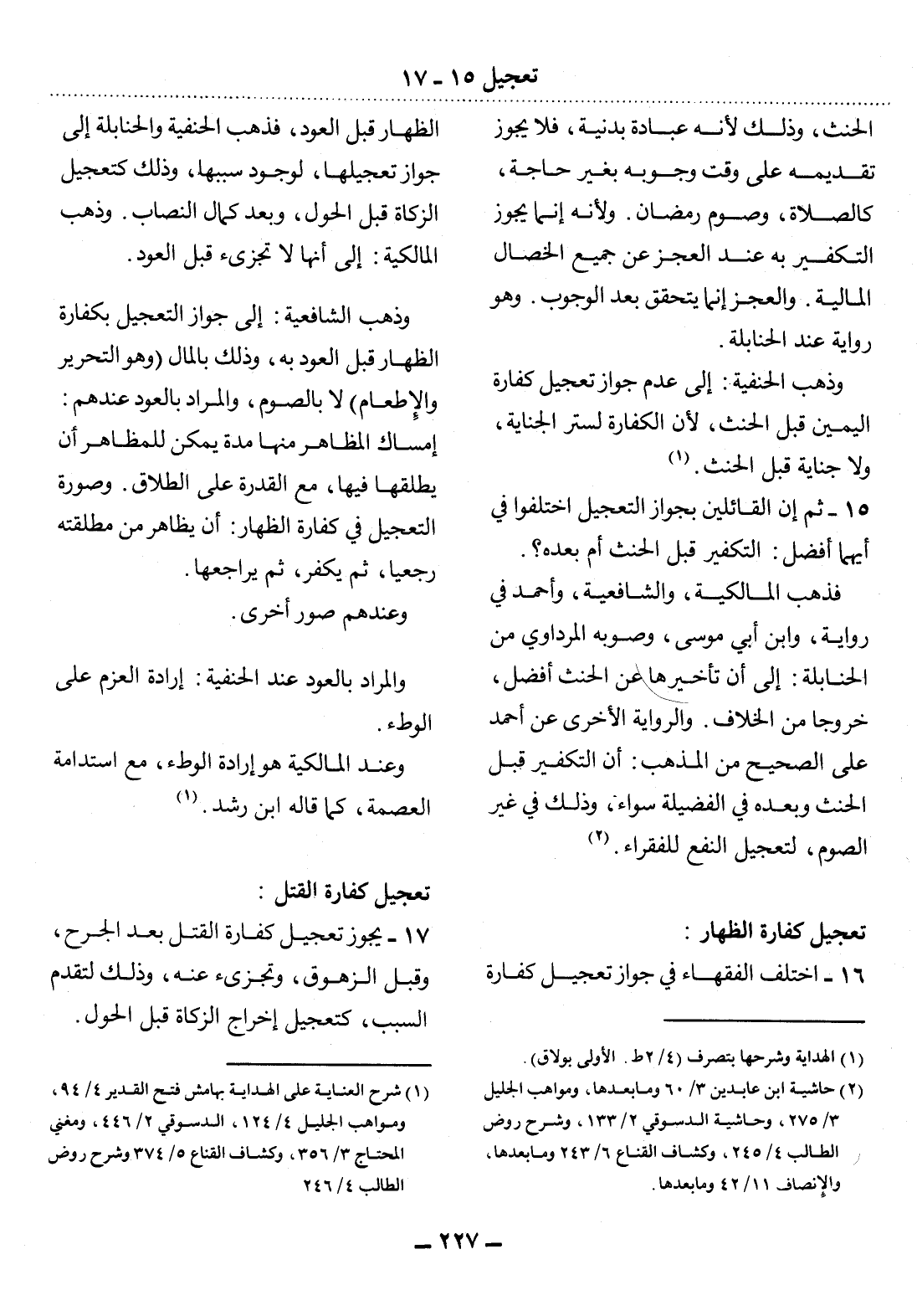 17 - يَجُوزُ تَعْجِيل كَفَّارَةِ الْقَتْل بَعْدَ الْجُرْحِ، وَقَبْل الزُّهُوقِ، وَتُجْزِئُ عَنْهُ، وَذَلِكَ لِتَقَدُّمِ السَّبَبِ، كَتَعْجِيل إِخْرَاجِ الزَّكَاةِ قَبْل الْحَوْل.
