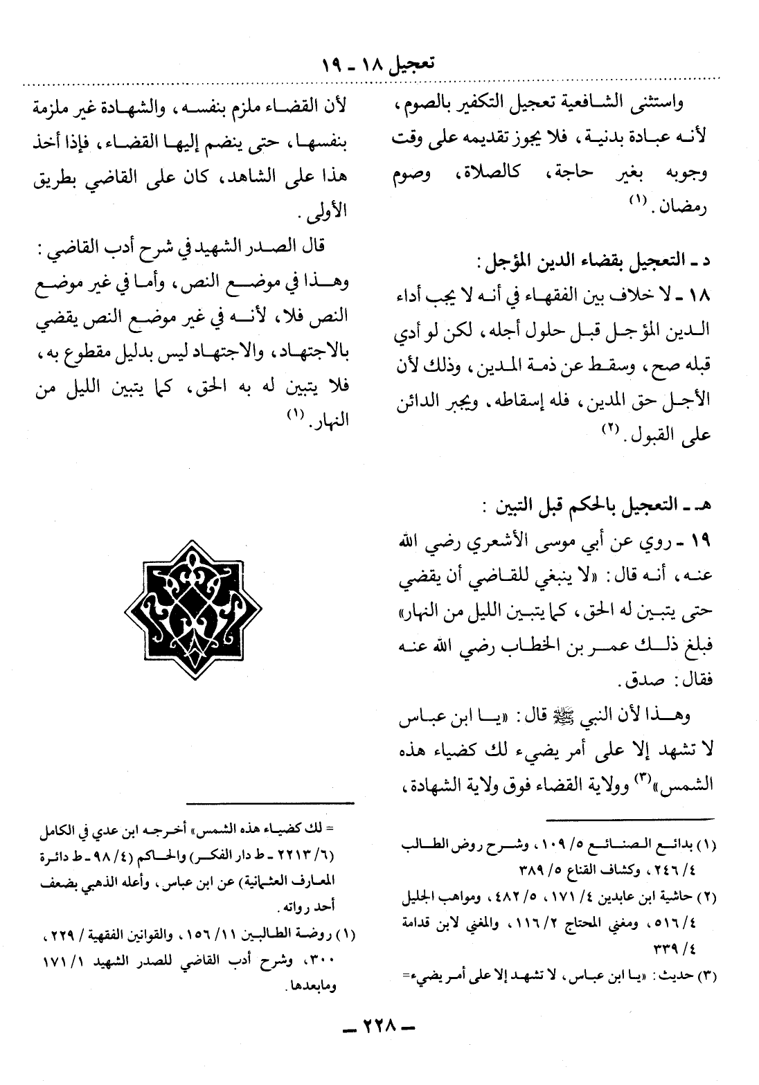 وَهَذَا لأَِنَّ النَّبِيَّ صَلَّى اللَّهُ عَلَيْهِ وَسَلَّمَ قَال: يَا ابْنَ عَبَّاسٍ لاَ تَشْهَدْ إِلاَّ عَلَى أَمْرٍ يُضِيءُ لَكَ كَضِيَاءِ هَذَا الشَّمْسِ (3) وَوِلاَيَةُ الْقَضَاءِ فَوْقَ وِلاَيَةِ الشَّهَادَةِ؛