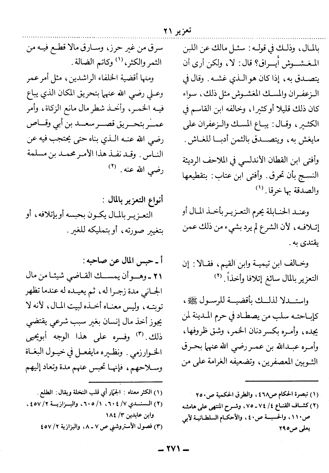 21 - وَهُوَ أَنْ يُمْسِكَ الْقَاضِي شَيْئًا مِنْ مَال الْجَانِي مُدَّةً زَجْرًا لَهُ، ثُمَّ يُعِيدُهُ لَهُ عِنْدَمَا تَظْهَرُ تَوْبَتُهُ، وَلَيْسَ مَعْنَاهُ أَخْذُهُ لِبَيْتِ الْمَال؛ لأَِنَّهُ لاَ يَجُوزُ أَخْذُ مَال إِنْسَانٍ بِغَيْرِ سَبَبٍ شَرْعِيٍّ يَقْتَضِي ذَلِكَ (3) . وَفَسَّرَهُ عَلَى هَذَا الْوَجْهِ أَبُو يَحْيَى الْخُوَارِزْمِيُّ. وَنَظِيرُهُ مَا يُفْعَل فِي خُيُول الْبُغَاةِ وَسِلاَحِهِمْ، فَإِِنَّهَا تُحْبَسُ عَنْهُمْ مُدَّةً وَتُعَادُ إِلَيْهِمْ