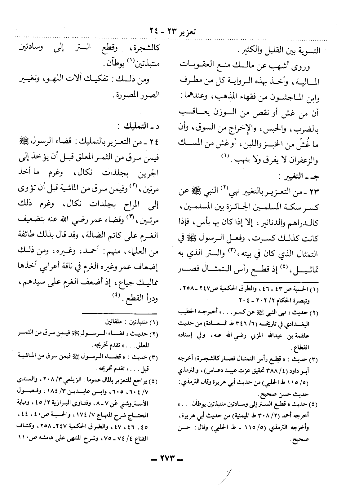 23 - مِنَ التَّعْزِيرِ بِالتَّغْيِيرِ نَهْيُ (2) النَّبِيِّ صَلَّى اللَّهُ عَلَيْهِ وَسَلَّمَ عَنْ كَسْرِ سِكَّةِ الْمُسْلِمِينَ الْجَائِزَةِ بَيْنَ الْمُسْلِمِينَ، كَالدَّرَاهِمِ وَالدَّنَانِيرِ، إِلاَّ إِِذَا كَانَ بِهَا بَأْسٌ، فَإِِذَا كَانَتْ كَذَلِكَ كُسِرَتْ، وَفِعْل الرَّسُول صَلَّى اللَّهُ عَلَيْهِ وَسَلَّمَ فِي التِّمْثَال الَّذِي كَانَ فِي بَيْتِهِ (3) ، وَالسِّتْرِ الَّذِي بِهِ تَمَاثِيل (4) ، إِذْ قَطَعَ رَأْسَ التِّمْثَال فَصَارَ