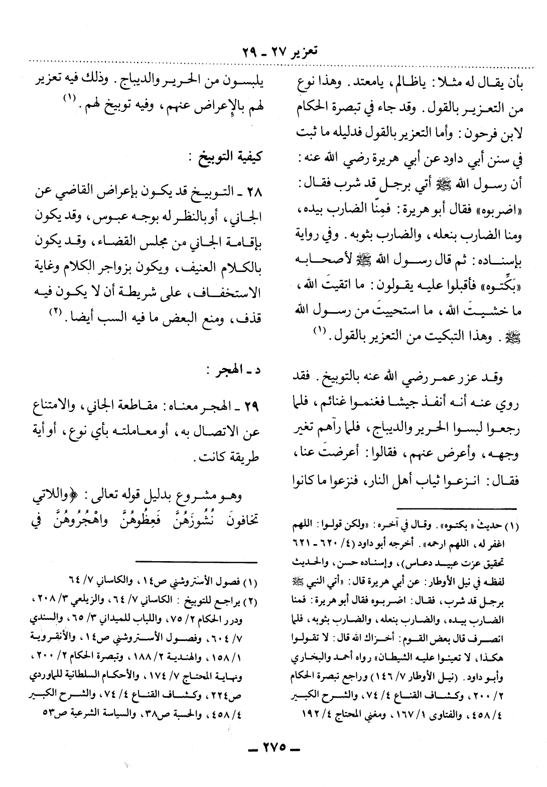 (2) يراجع للتوبيخ: الكاساني 7 / 64، والزيلعي 3 / 208، ودرر الحكام 2 / 75، واللباب للميداني 3 / 65، والسندي 7 / 604، وفصول الأستروشني ص 14، والأنقروية 1 / 158، والهندية 2 / 188، وتبصرة الحكام 2 / 200، ونهاية المحتاج 7 / 174، والأحكام السلطانية للماوردي ص 224، وكشاف القناع 4 / 74، والشرح الكبير 4 / 458، والحسبة ص 38، والسياسة الشرعية ص 53.