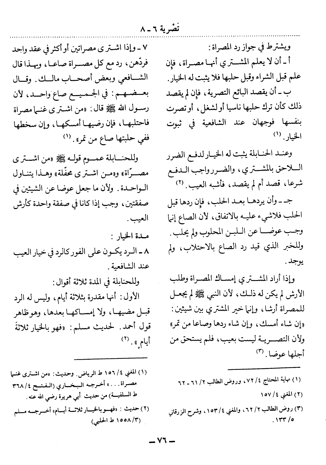(1) المغني 4 / 156 ط الرياض. وحديث: " من اشترى غنما مصراة. . . " أخرجه البخاري (الفتح 4 / 368 ط السلفية) من حديث أبي هريرة رضي الله عنه.