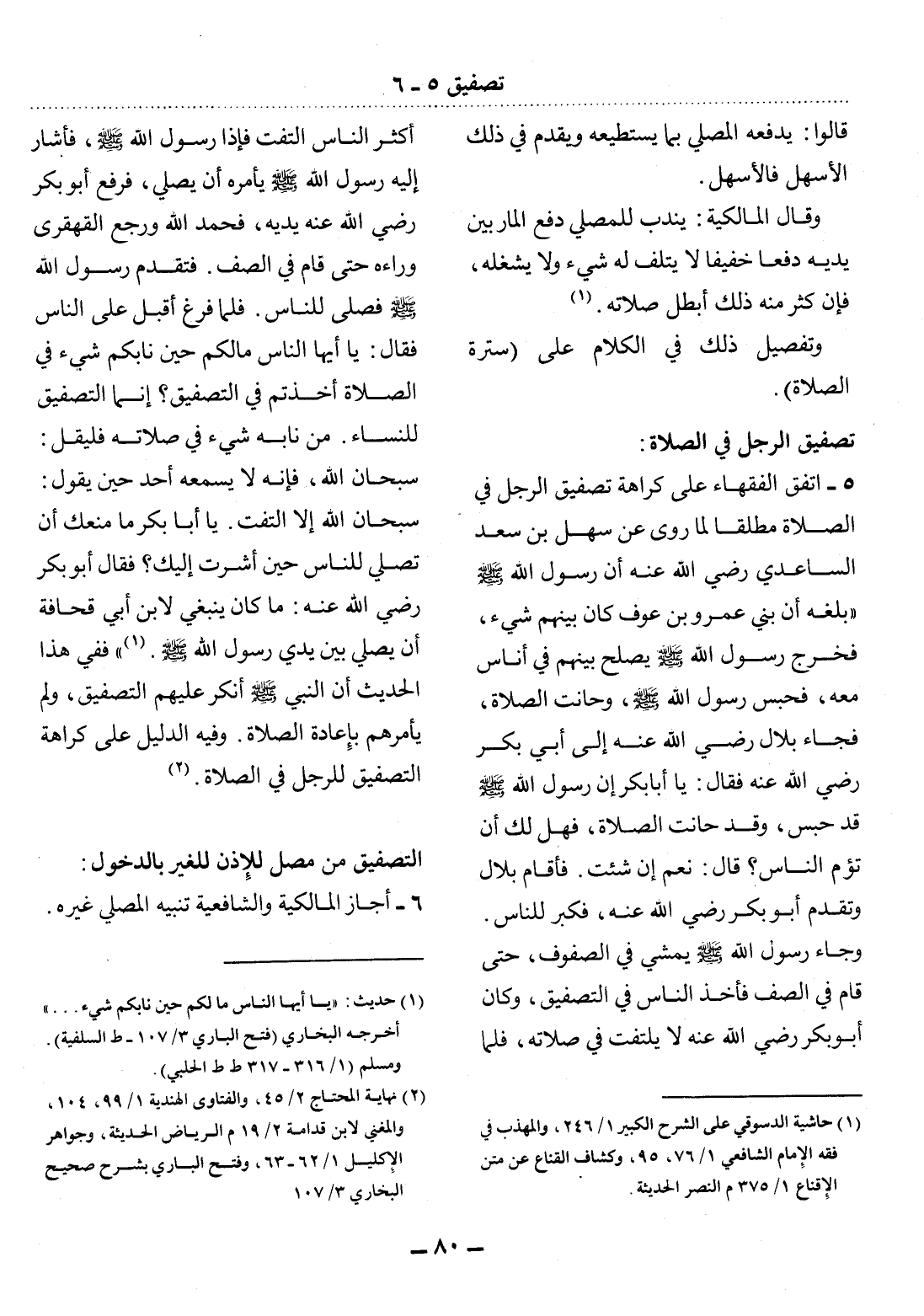 أَكْثَرَ النَّاسُ الْتَفَتَ فَإِِذَا رَسُول اللَّهِ صَلَّى اللَّهُ عَلَيْهِ وَسَلَّمَ فَأَشَارَ إِلَيْهِ رَسُول اللَّهِ صَلَّى اللَّهُ عَلَيْهِ وَسَلَّمَ يَأْمُرُهُ أَنْ يُصَلِّيَ، فَرَفَعَ أَبُو بَكْرٍ رَضِيَ اللَّهُ عَنْهُ يَدَيْهِ، فَحَمِدَ اللَّهَ وَرَجَعَ الْقَهْقَرَى وَرَاءَهُ حَتَّى قَامَ فِي الصَّفِّ. فَتَقَدَّمَ رَسُول اللَّهِ صَلَّى اللَّهُ عَلَيْهِ وَسَلَّمَ فَصَلَّى لِلنَّاسِ. فَلَمَّا فَرَغَ أَقْبَل عَلَى النَّاسِ فَقَال: يَا أَيُّهَا النَّاسُ مَا لَكُمْ حِينَ نَابَكُمْ شَيْءٌ فِي الصَّلاَةِ أَخَذْتُمْ فِي التَّصْفِيقِ؟ إِنَّمَا التَّصْفِيقُ لِلنِّسَاءِ. مَنْ نَابَهُ شَيْءٌ فِي صَلاَتِهِ فَلْيَقُل: سُبْحَانَ اللَّهِ، فَإِِنَّهُ لاَ يَسْمَعُهُ أَحَدٌ حِينَ يَقُول: سُبْحَانَ اللَّهِ إِلاَّ الْتَفَتَ. يَا أَبَا بَكْرٍ مَا مَنَعَكَ أَنْ تُصَلِّيَ لِلنَّاسِ حِينَ أَشَرْتُ إِلَيْكَ؟ فَقَال أَبُو بَكْرٍ رَضِيَ اللَّهُ عَنْهُ: مَا كَانَ يَنْبَغِي لاِبْنِ أَبِي قُحَافَةَ أَنْ يُصَلِّيَ بَيْنَ يَدَيْ رَسُول اللَّهِ صَلَّى اللَّهُ عَلَيْهِ وَسَلَّمَ. (1) " فَفِي هَذَا الْحَدِيثِ أَنَّ النَّبِيَّ صَلَّى اللَّهُ عَلَيْهِ وَسَلَّمَ أَنْكَرَ عَلَيْهِمُ التَّصْفِيقَ، وَلَمْ يَأْمُرْهُمْ بِإِِعَادَةِ الصَّلاَةِ. وَفِيهِ الدَّلِيل عَلَى كَرَاهَةِ التَّصْفِيقِ لِلرَّجُل فِي الصَّلاَةِ (2) .