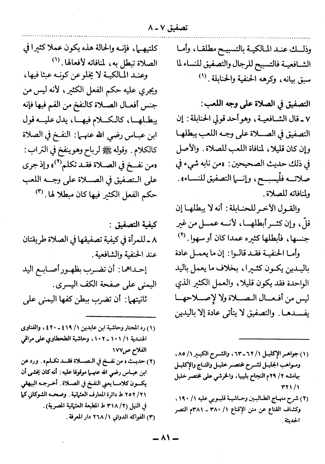 8 - لِلْمَرْأَةِ فِي كَيْفِيَّةِ تَصْفِيقِهَا فِي الصَّلاَةِ طَرِيقَتَانِ عِنْدَ الْحَنَفِيَّةِ وَالشَّافِعِيَّةِ.