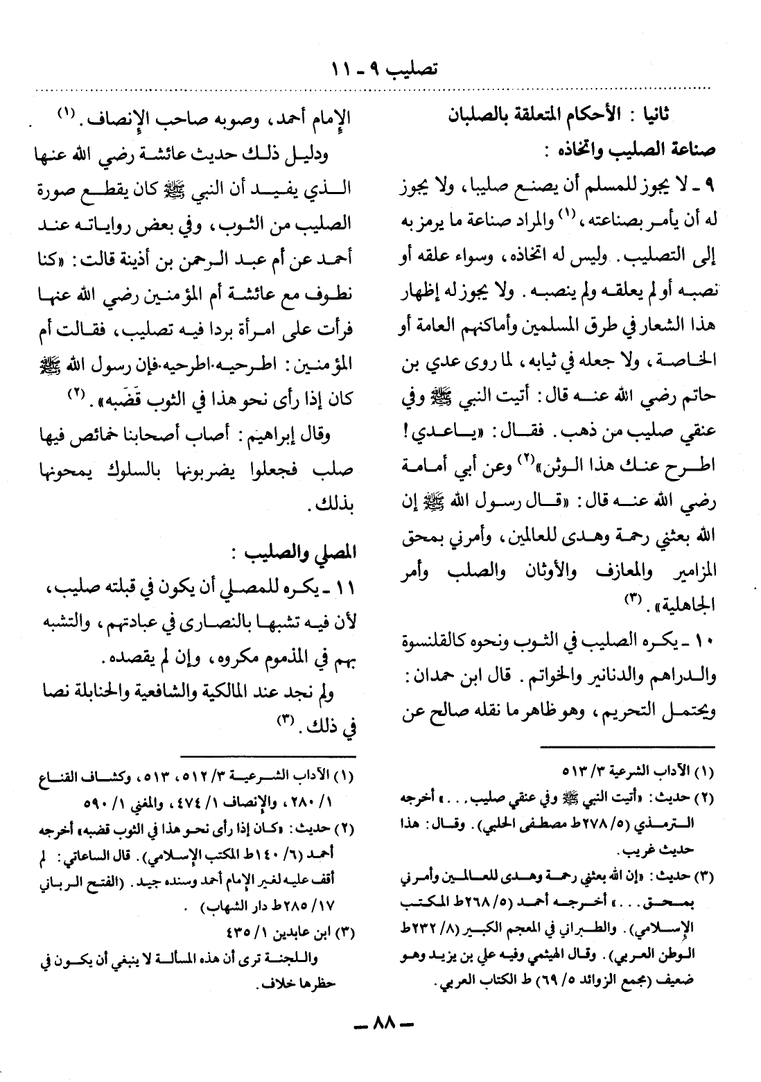 9 - لاَ يَجُوزُ لِلْمُسْلِمِ أَنْ يَصْنَعَ صَلِيبًا، وَلاَ يَجُوزُ لَهُ أَنْ يَأْمُرَ بِصِنَاعَتِهِ، (1) وَالْمُرَادُ صِنَاعَةُ مَا يُرْمَزُ بِهِ إِِلَى التَّصْلِيبِ. وَلَيْسَ لَهُ اتِّخَاذُهُ، وَسَوَاءٌ عَلَّقَهُ أَوْ نَصَبَهُ أَوْ لَمْ يُعَلِّقْهُ وَلَمْ يَنْصِبْهُ. وَلاَ يَجُوزُ لَهُ إِظْهَارُ هَذَا الشِّعَارِ فِي طُرُقِ الْمُسْلِمِينَ وَأَمَاكِنِهِمُ الْعَامَّةِ أَوِ الْخَاصَّةِ، وَلاَ جَعْلُهُ فِي ثِيَابِهِ، لِمَا رَوَى عَدِيُّ بْنُ حَاتِمٍ رَضِيَ اللَّهُ عَنْهُ قَال: أَتَيْتُ النَّبِيَّ صَلَّى اللَّهُ عَلَيْهِ وَسَلَّمَ وَفِي عُنُقِي صَلِيبٌ مِنْ ذَهَبٍ. فَقَال: يَا عَدِيُّ، اطْرَحْ عَنْكَ هَذَا الْوَثَنَ (2) وَعَنْ أَبِي أُمَامَةَ رَضِيَ اللَّهُ عَنْهُ قَال: " قَال رَسُول اللَّهِ صَلَّى اللَّهُ عَلَيْهِ وَسَلَّمَ إِنَّ اللَّهَ بَعَثَنِي رَحْمَةً وَهُدًى لِلْعَالَمِينَ، وَأَمَرَنِي بِمَحْقِ الْمَزَامِيرِ وَالْمَعَازِفِ وَالأَْوْثَانِ وَالصُّلُبِ وَأَمْرِ الْجَاهِلِيَّةِ. (3)