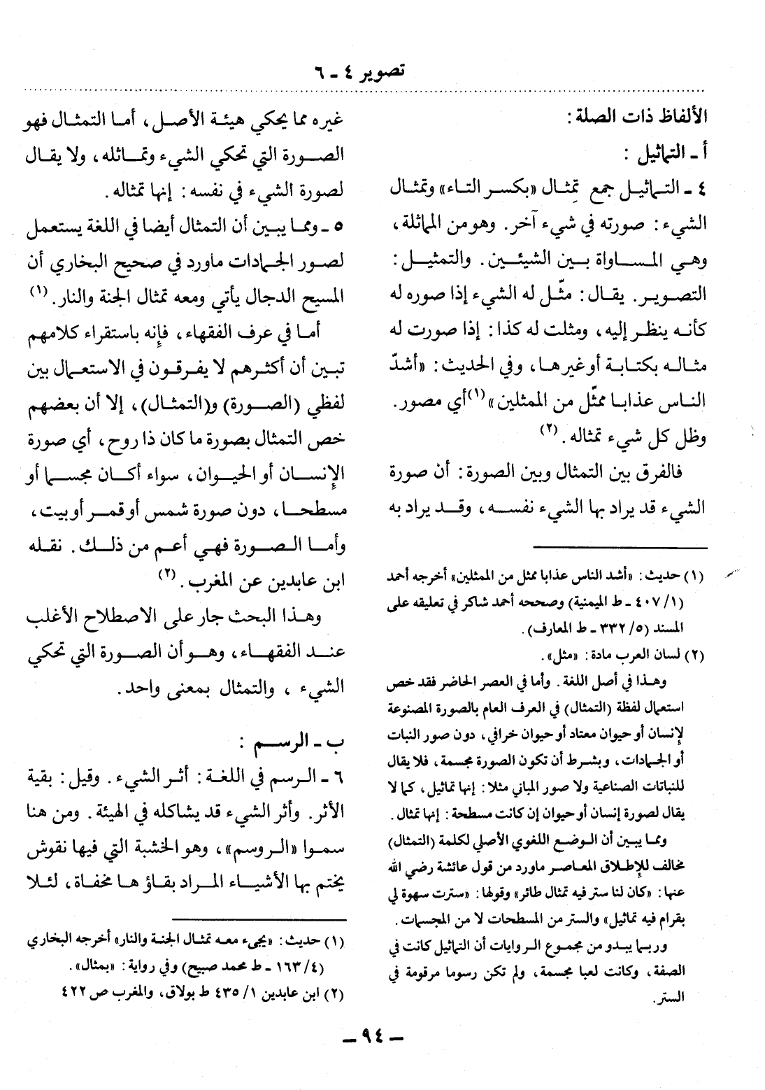 (2) لسان العرب مادة: " مثل ". وهذا في أصل اللغة. وأما في العصر الحاضر فقد خص استعمال لفظة (التمثال) في العرف العام بالصورة المصنوعة لإنسان أو حيوان معتاد أو حيوان خرافي، دون صور النبات أو الجمادات، وبشرط أن تكون الصورة مجسمة، فلا يقال للنباتات الصناعي