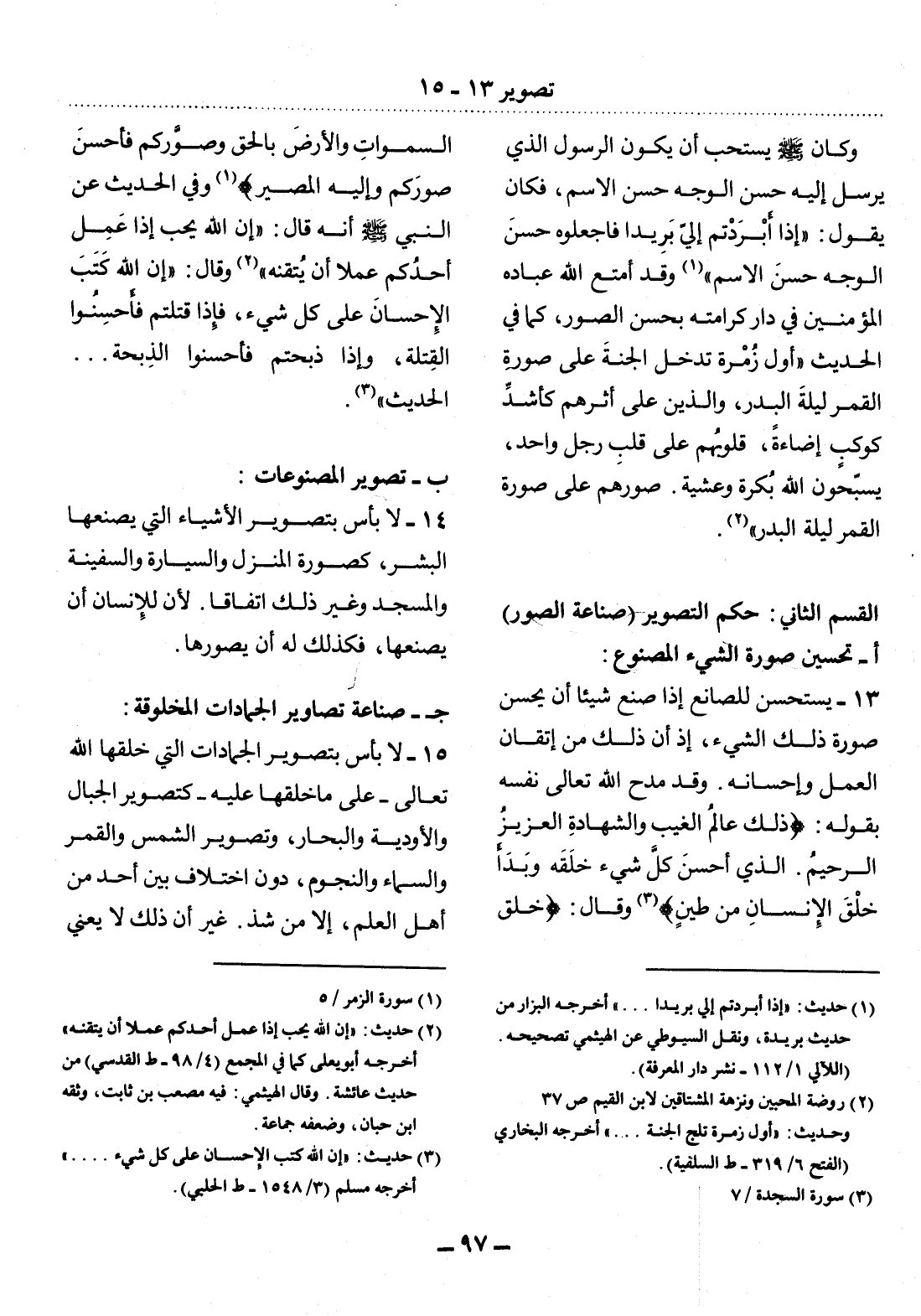 13 - يُسْتَحْسَنُ لِلصَّانِعِ إِِذَا صَنَعَ شَيْئًا أَنْ يُحَسِّنَ صُورَةَ ذَلِكَ الشَّيْءِ، إِذْ إِنَّ ذَلِكَ مِنْ إِتْقَانِ الْعَمَل وَإِِحْسَانِهِ. وَقَدْ مَدَحَ اللَّهُ تَعَالَى نَفْسَهُ بِقَوْلِهِ: {ذَلِكَ عَالِمُ الْغَيْبِ وَالشَّهَادَةِ الْعَزِيزُ الرَّحِيمُ الَّذِي أَحْسَن كُل شَيْءٍ خَلَقَهُ وَبَدَأَ خَلْقَ الإِِْنْسَانِ مِنْ طِينٍ} (3) وَقَال: {خَلَقَ