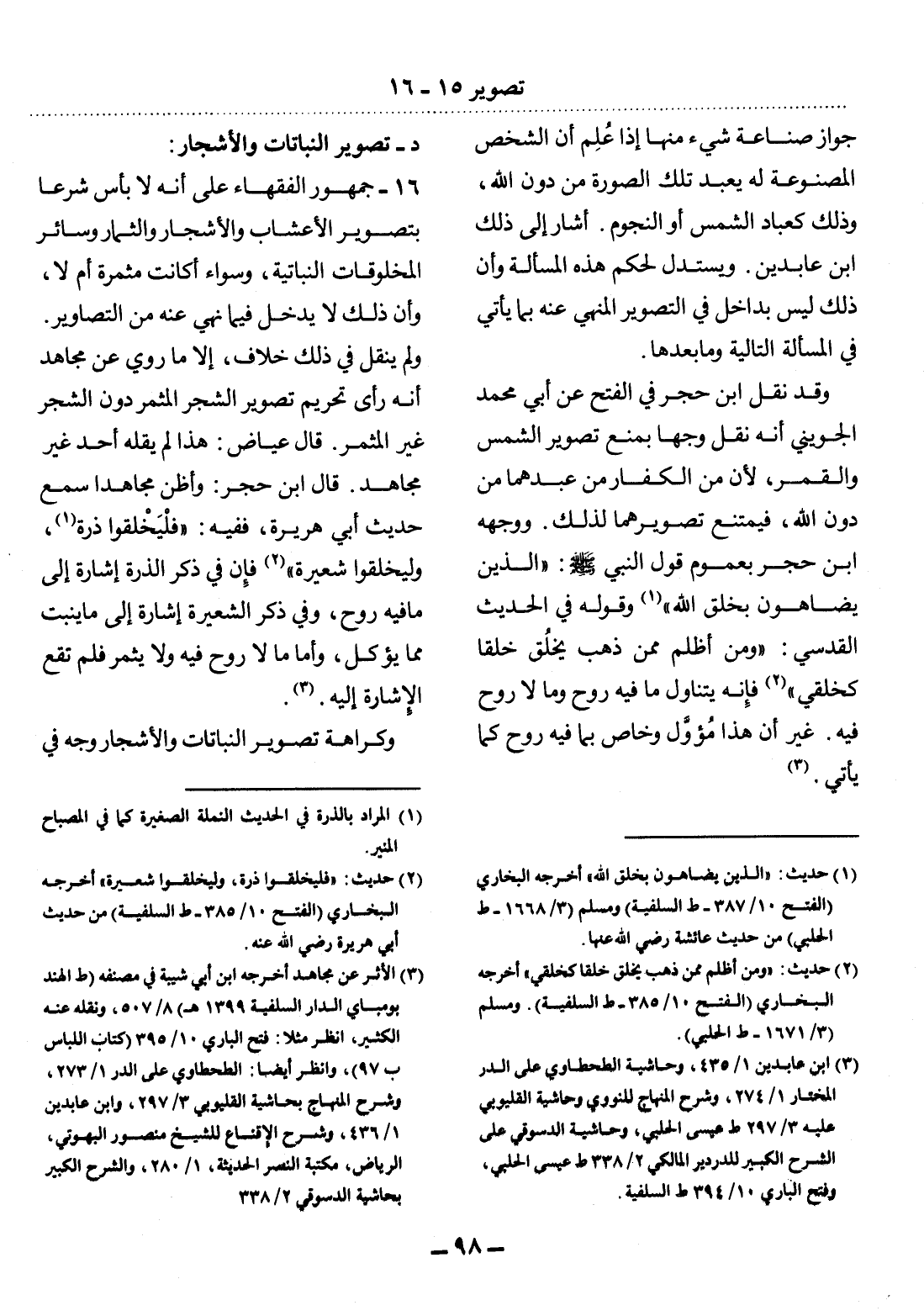 16 - جُمْهُورُ الْفُقَهَاءِ عَلَى أَنَّهُ لاَ بَأْسَ شَرْعًا بِتَصْوِيرِ الأَْعْشَابِ وَالأَْشْجَارِ وَالثِّمَارِ وَسَائِرِ الْمَخْلُوقَاتِ النَّبَاتِيَّةِ، وَسَوَاءٌ أَكَانَتْ مُثْمِرَةً أَمْ لاَ، وَأَنَّ ذَلِكَ لاَ يَدْخُل فِيمَا نُهِيَ عَنْهُ مِنَ التَّصَاوِيرِ.